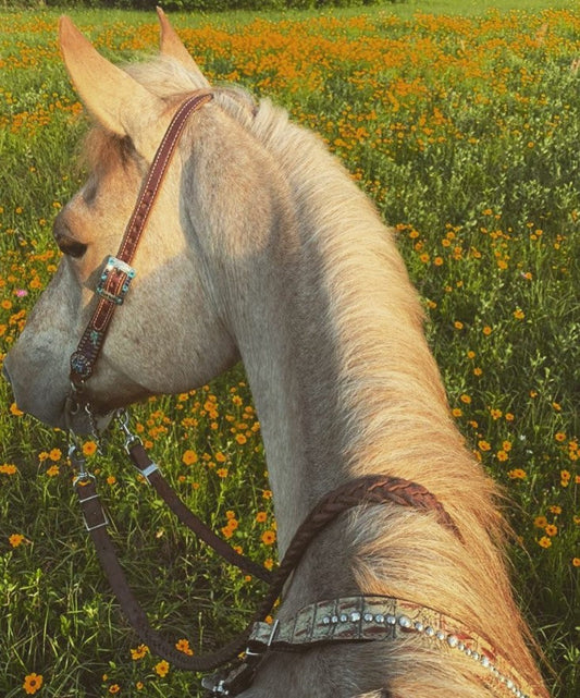 2074-AO 5/8" Wave one ear headstall rough out toast leather with tooled patch, buckstitch, braided loops, and Spanish lace hardware