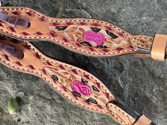 382-TTBS Ladies spur straps toast leather TTBS tooling with backstitch and background paint