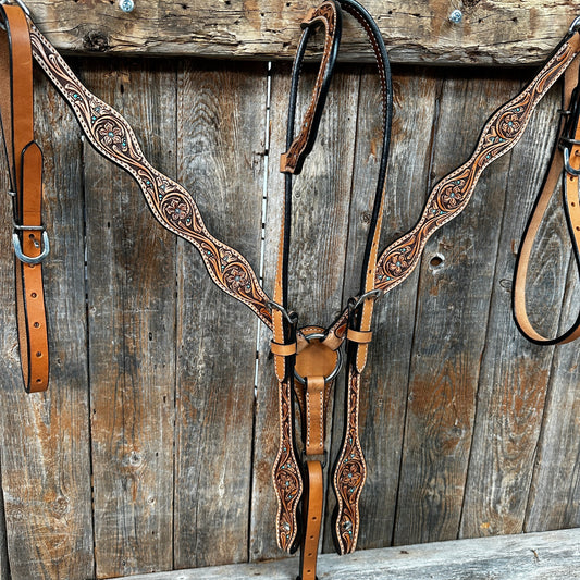 Light Oil Floral Tooled Buckaroo Style One Ear Headstall / Bridle