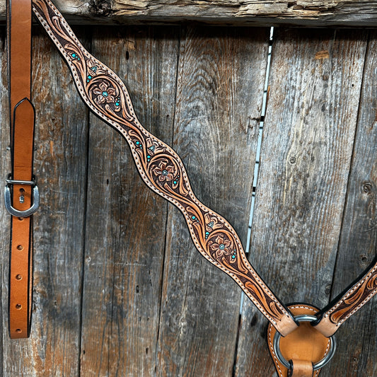 Light Oil Floral Tooled Orange and Teal Browband & Breastcollar Tack Set #BBBC427