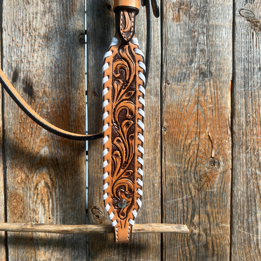 Light Oil Floral Tooled with White Whipstitch One Ear Headstall / Bridle