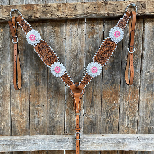 Light Oil Whipstitch White Daisy One Ear/ Breastcollar Tack Set #OEBC519