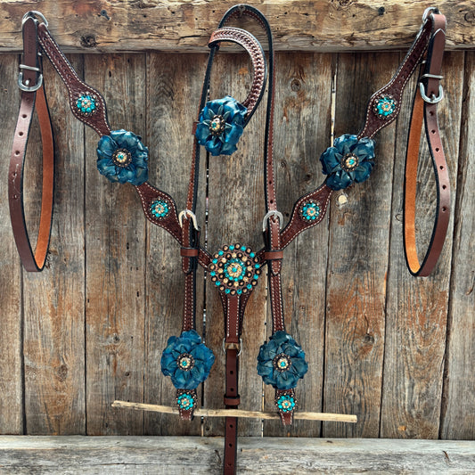 Medium Oil Basketweave Flower and Cactus Browband/One Ear Tack Set #BBBC491