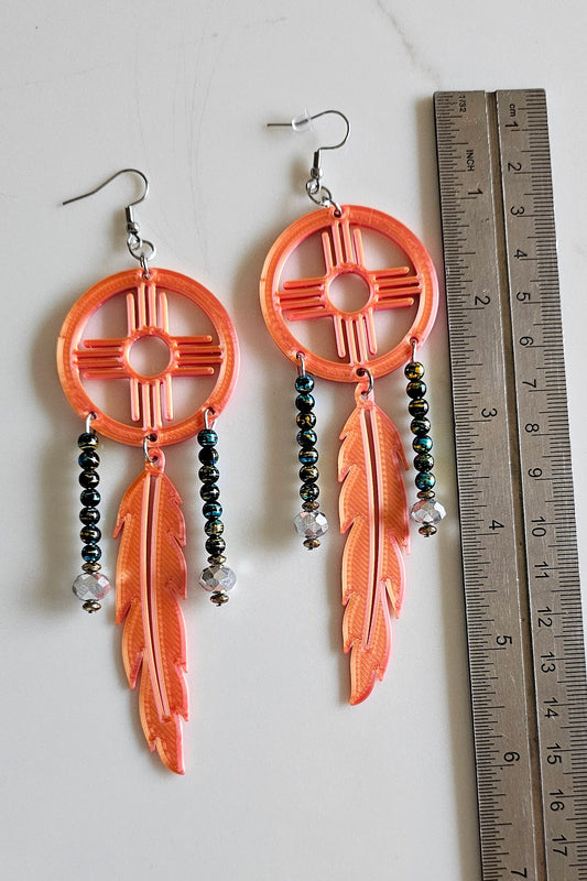 3D print Lightweight Orange New Mexico Zia Feather Dream Catcher Earrings Made in America