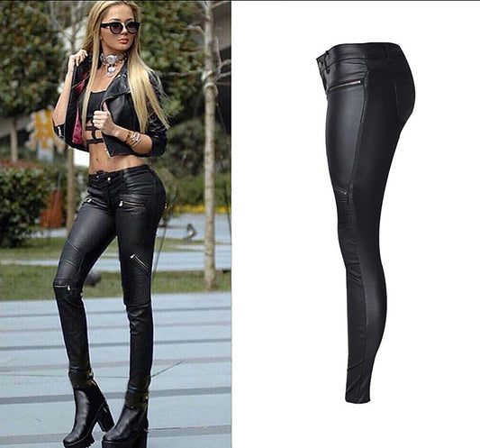 Edgy Rebel High-Waist Skinny Leather Pants – Shiny Black Faux Leather, Street Style, Motorcycle Chic