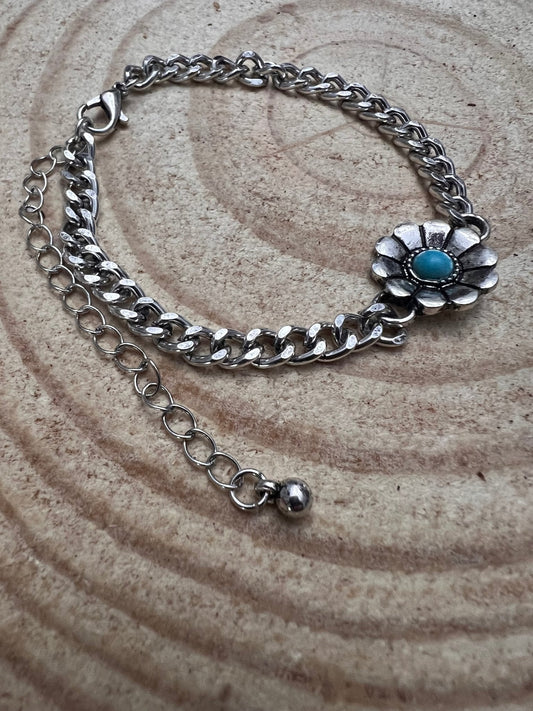 Flower and Faux Turquoise Cuban Chain Bracelet
