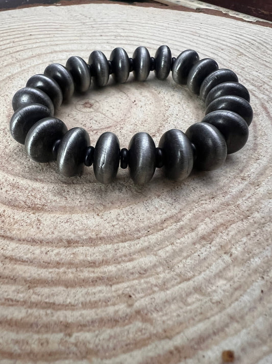 Western Faux Saucer Pearl Stretch Bracelet with Black Stone - 6 1/2 inch