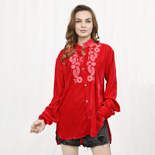 American Darling ADDR003 100% Cotton Denim Women Shirt Jacket Dress Ladies Girl Top Red