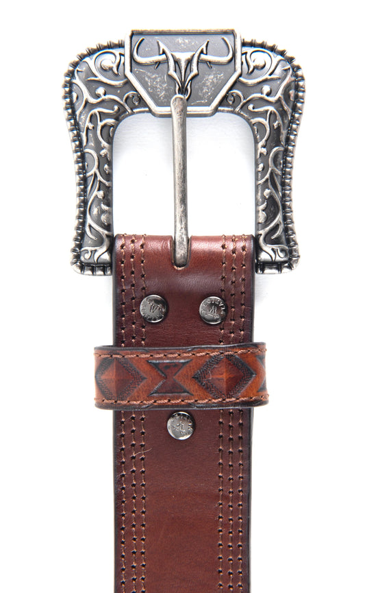 Mens Genuine Leather Aztec 3D Embossed Belt - Brown