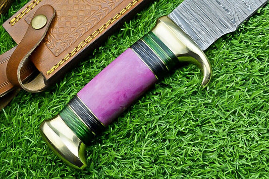 Damascus Steel Hunting Knife – 10" with Brass Guard & Resin Pakkawood Handle, Leather Sheath Included