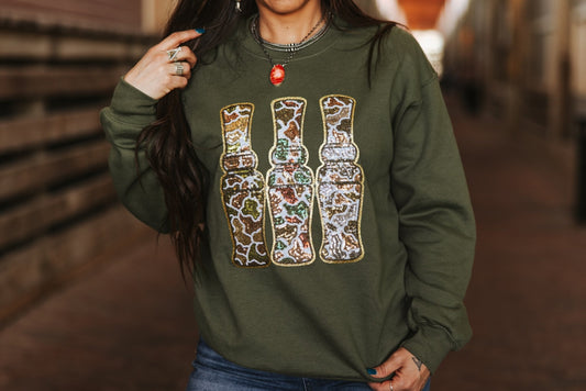 Sequin Hunting Duck Calls Patch Sweatshirt