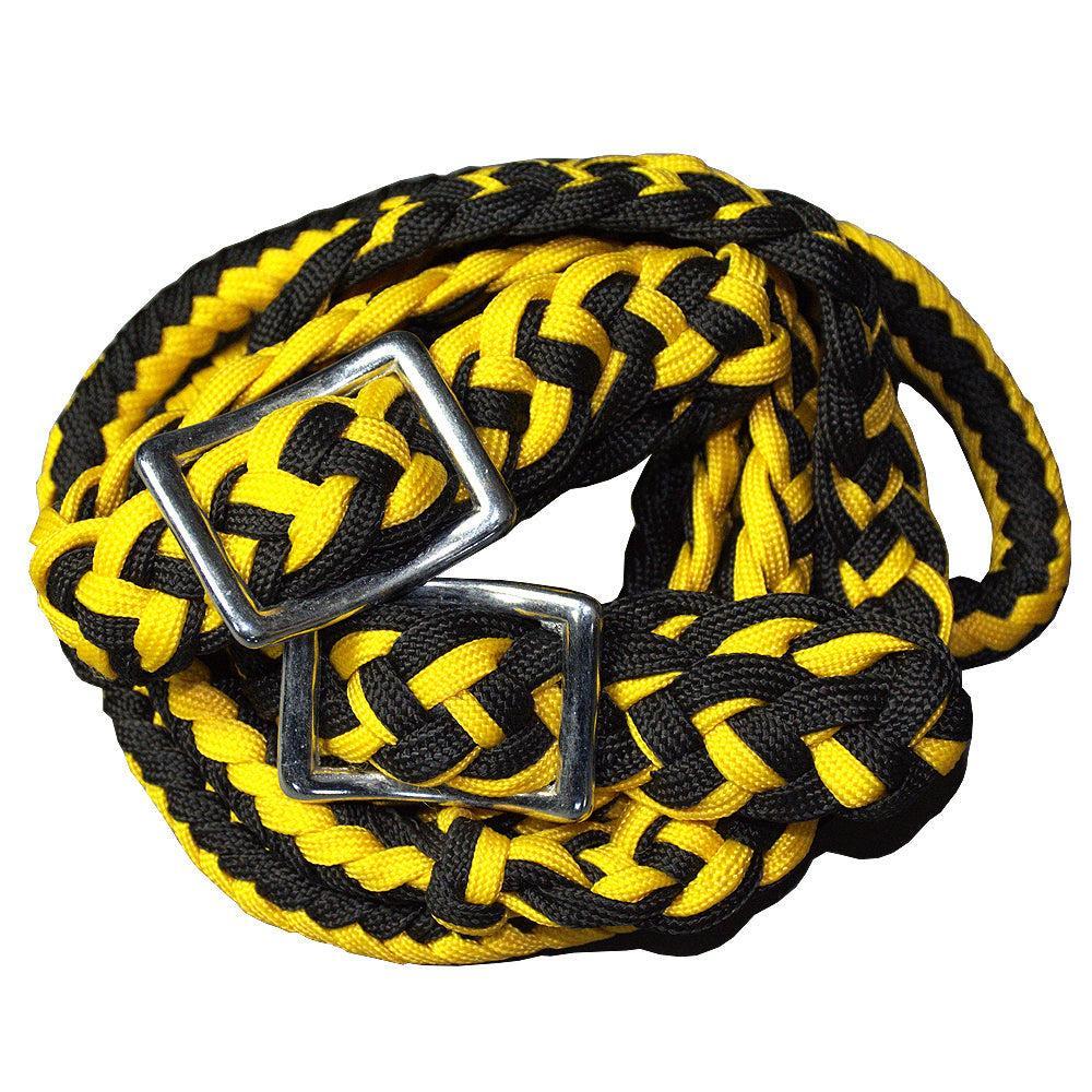 Western Horse Tack Poly Barrel Reins: Barrel reins are dependable second aid for steering and controlling your horse's movements. While roper reins employ a single, long continuous rein that fastens to both ends of the bit, Barrel reins have two separate reins that attach to the bit.These are premium quality 1" X 8 ft. soft Poly Contest Barrel Racing reins with conveniently located 4 knots for easy and comfortable grip. The braiding is very professional and has no "hollow" feel on them. The two Conway buckles used on these reins are all nickel plated for durability and adjustment. It is not the regular cheap imports you would commonly find. It is the perfect contest reins for Barrel racing or simple trail riding. You can use it for a very long period.