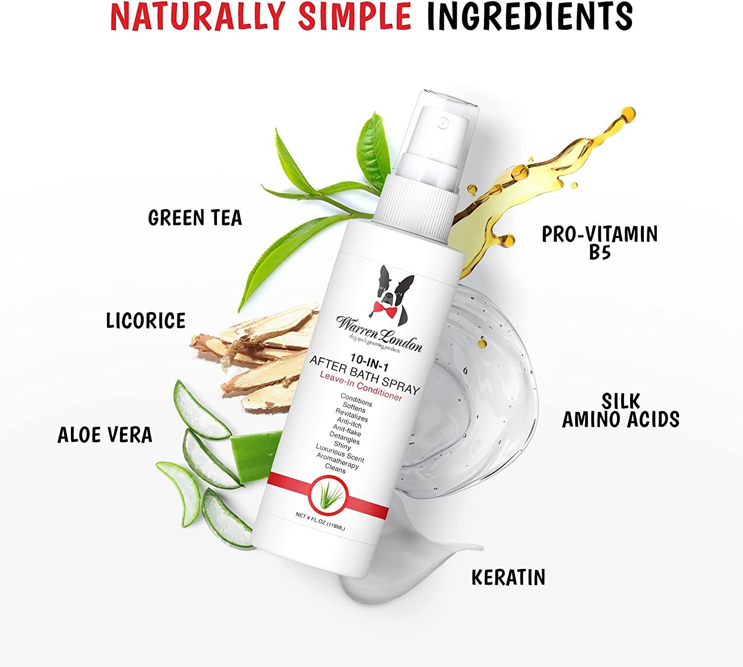Directions: For best results, use product directly after bathing your dog. Spray an even amount of Warren London 10-in-1 After Bath Spray onto the dog’s coat. Although not critical, brushing the coat after spraying will help to even out the product and allow it to reach all parts of the coats. Let product dry into coat and do not wash off.