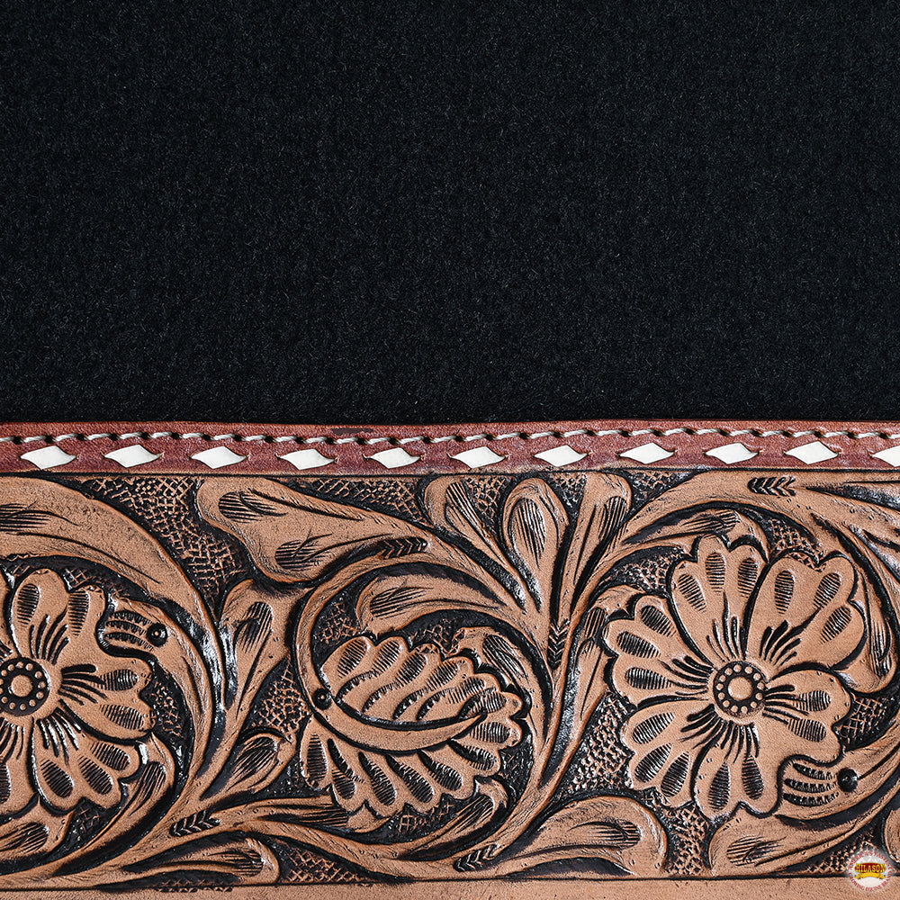 ✔ PREMIUM QUALITY MATERIALS: The HILASON Western Horse Saddle Pad is made of high-grade wool felt, offering exceptional shock absorption and comfort for your horse. This horse saddle pad has Hand Tooled top-grain genuine distressed wear leather for enhanced durability and style. Classic Black Color With Leather tooled Border . Approximate dimensions: 32" length x 30" width, with a 3/4" thickness.