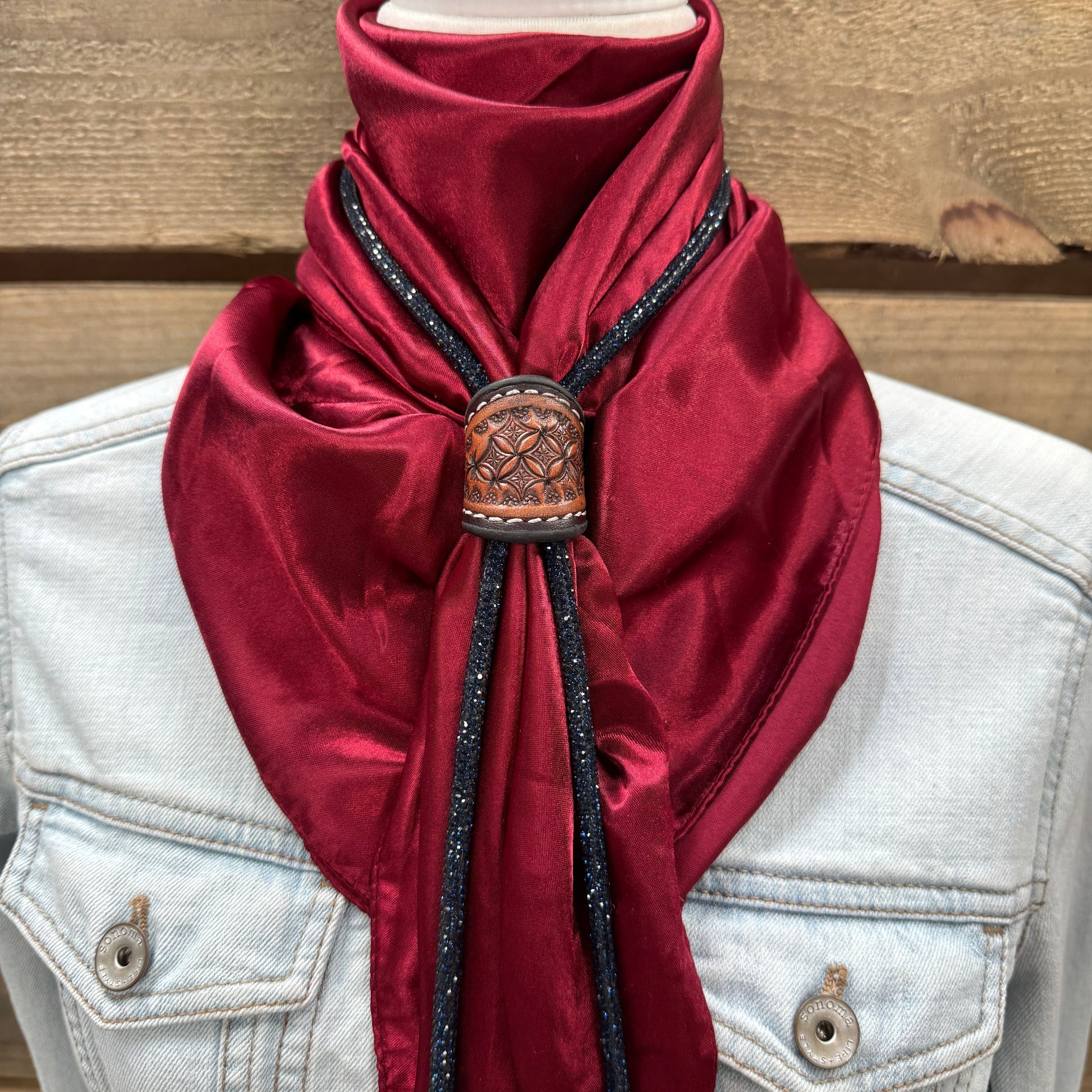 Our custom leather wild rag slide is paired with a navy bolo tie.