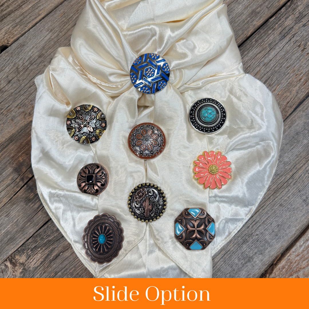 Western concho wild rag slides are assorted styles.