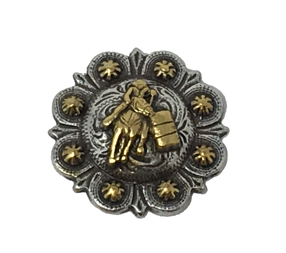 Enhance your gear with the high-quality AJ Tack Barrel Racer Berry Concho. This hand-polished western floral concho features a two-tone antique silver finish with a gold barrel racer and gold accents, adding a refined touch to saddles, tack, bags, belts, and more. Crafted from durable zinc and equipped with a 3⁄16" Chicago screw for secure and easy attachment.