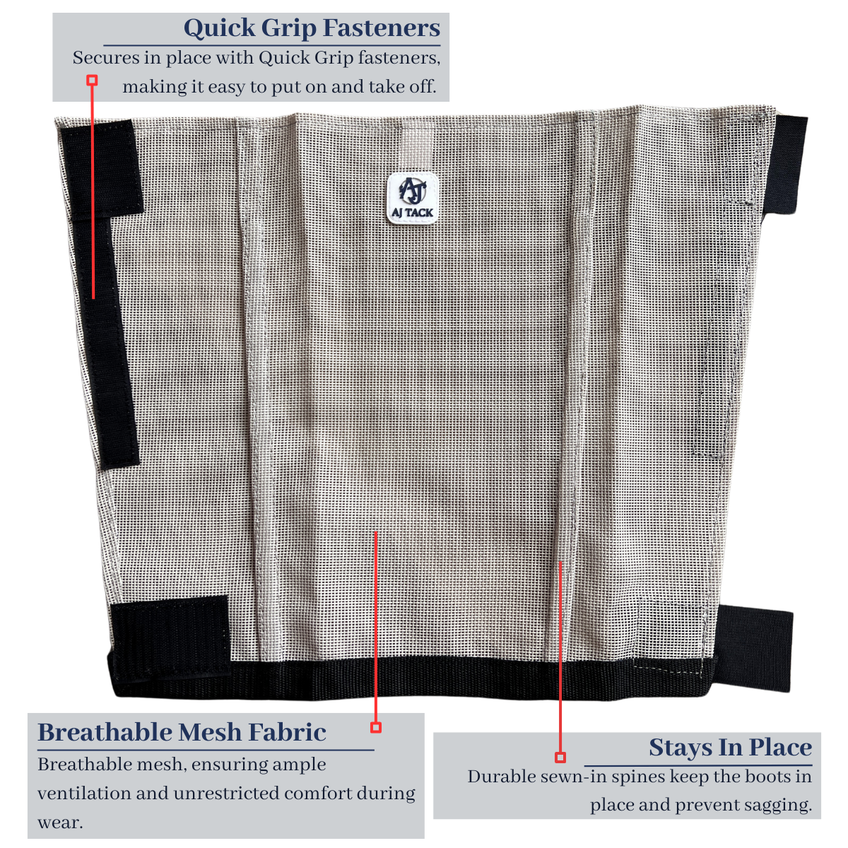 The AJ Tack Fly Boots are designed to keep your horse comfortable and pest-free. Made from breathable mesh, these boots prevent flies from bothering your horse and stop botflies from laying eggs. Sewn-in stays ensure these boots retain their shape and durability, even after long periods of wear. Sold in a pack of 4.