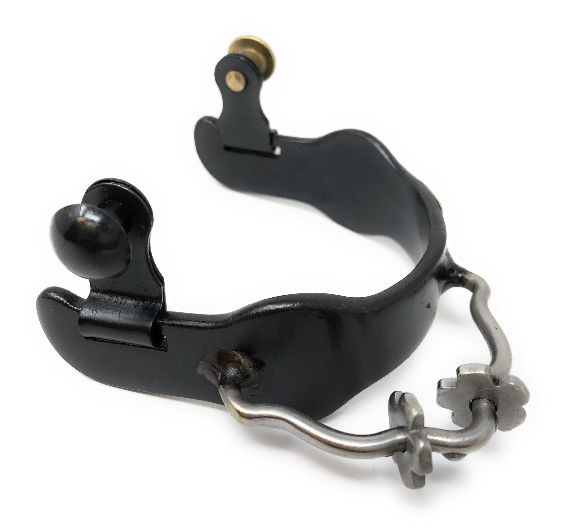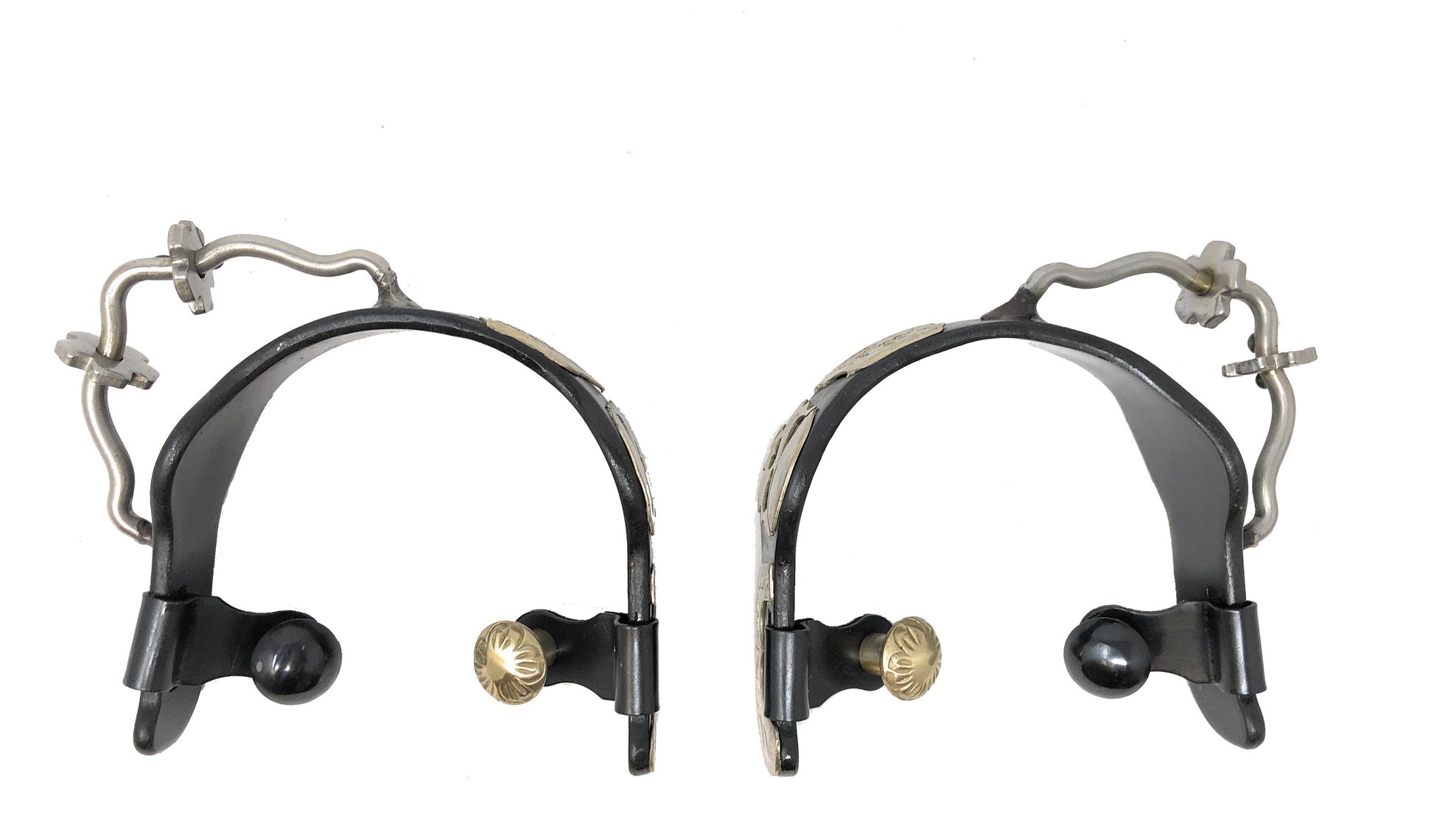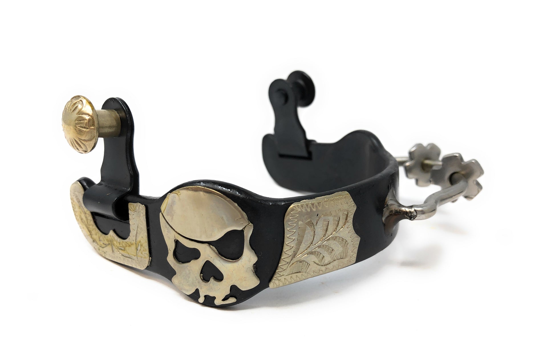 The AJ Tack Ladies Antique Brown Pirate Skull Bumper Spurs with Rowels combine function and a unique design. These black steel humane bumper spurs feature a silver pirate skull motif with hand-engraved silver overlay and flower engraving on the button. Designed for comfort and ease of use, these spurs are gentle on the horse and easy to put on and take off, making them perfect for training and shows.