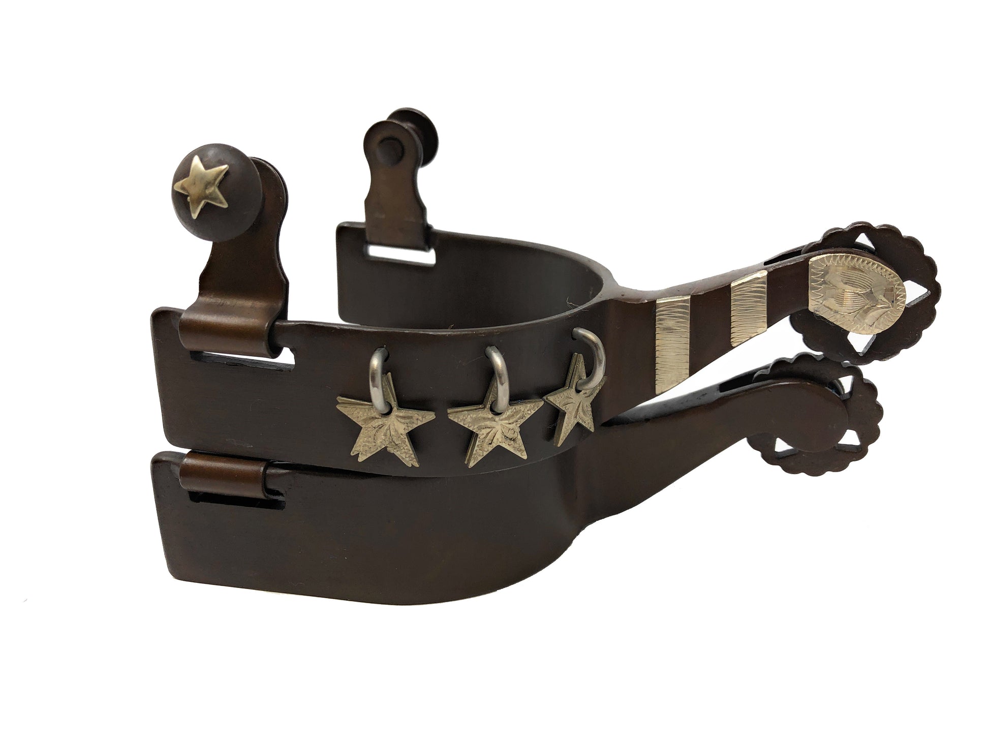 The AJ Tack Ladies Antique Brown Star Charm Spurs feature a beautiful hand-engraved silver overlay with hanging silver stars on the trim. These western show spurs are designed for ladies with a 2 1⁄2" opening and 2 1⁄2" depth, making them a perfect fit for added control and style.
