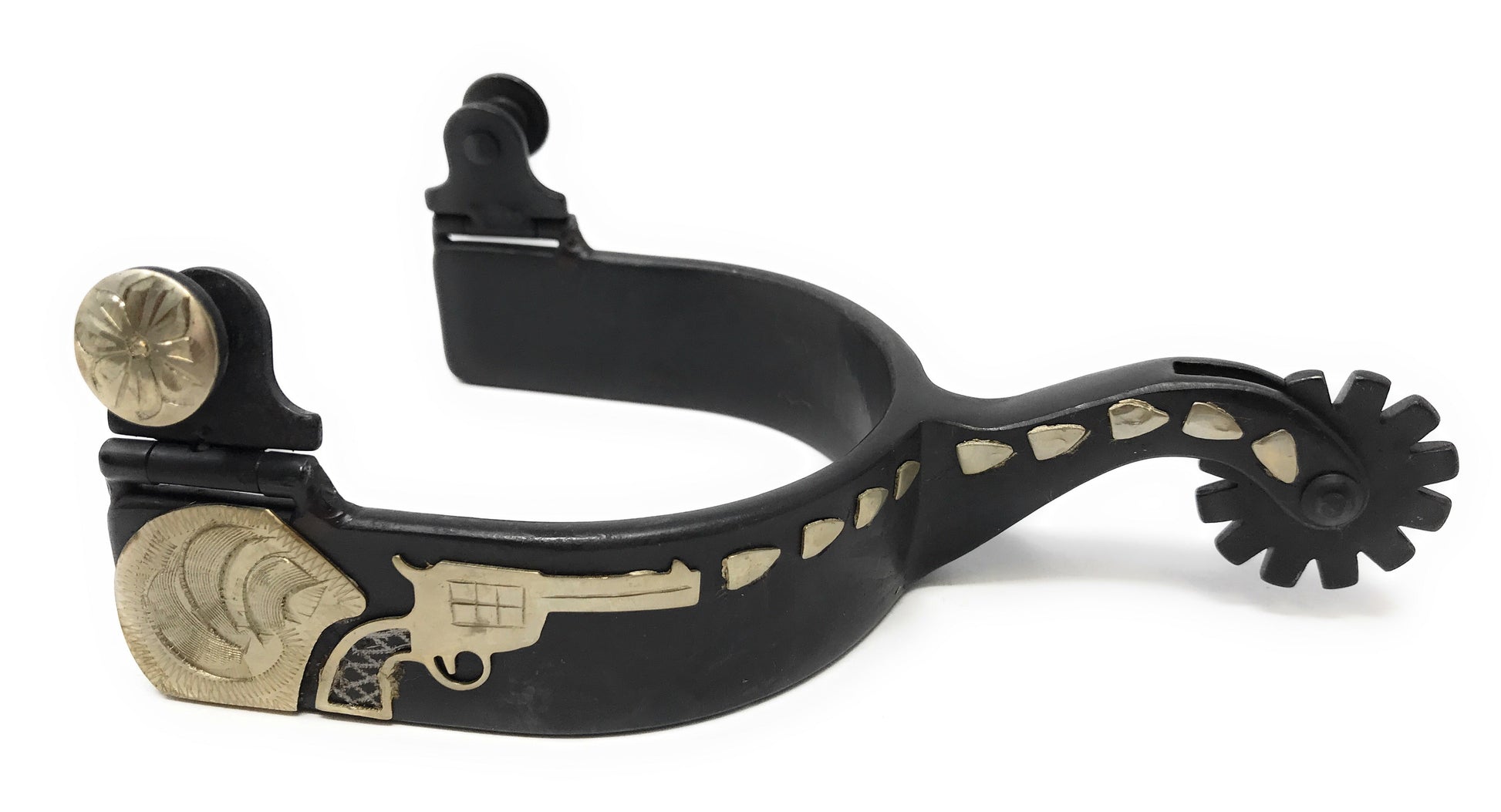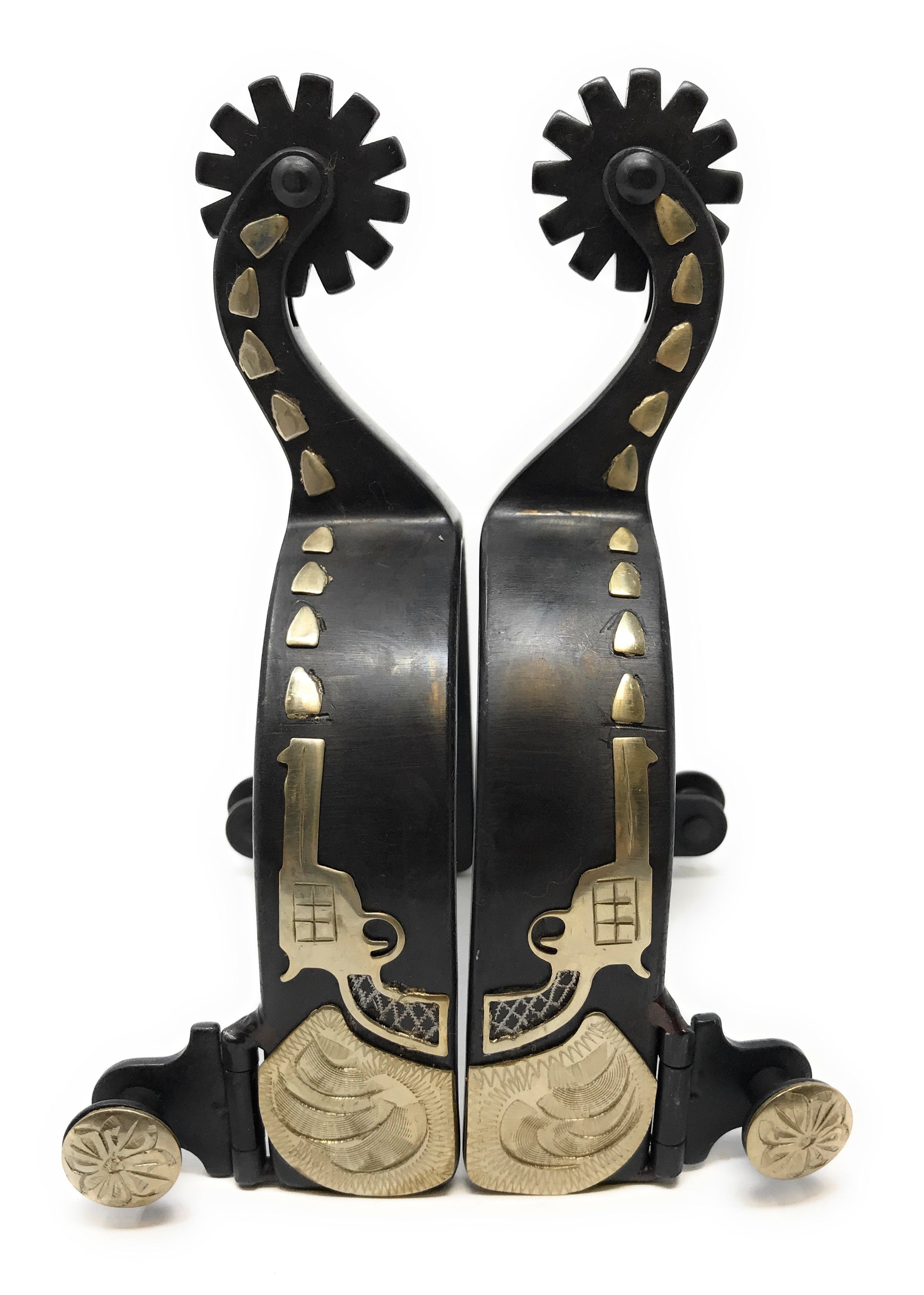 The AJ Tack Men's Antique Brown Revolver Spurs bring rugged style to the arena. Crafted from durable black steel, these western show spurs feature a hand-engraved silver overlay with a distinctive shooting motif. Silver-engraved buttons add an extra touch of craftsmanship, while the blunt rowels ensure practical functionality. Designed for performance and style, these spurs are an ideal choice for any cowboy.