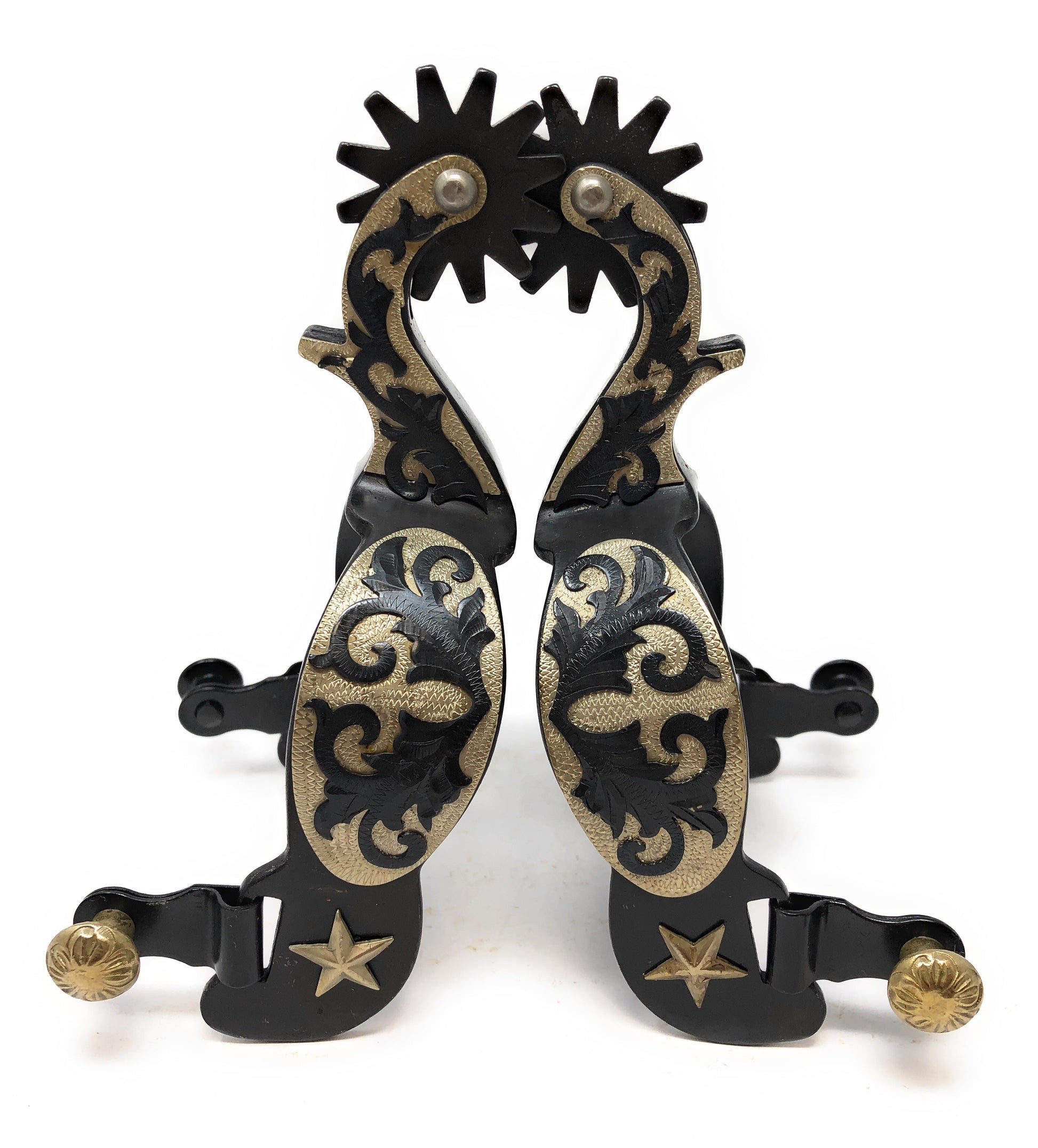 The AJ Tack Men's Antique Brown Star and Floral Spurs combine rugged functionality with elegant detailing. These black steel western show spurs feature a shaped band adorned with hand-engraved silver scrollwork and a prominent silver star. Designed with a chap guard for practicality, they deliver both style and performance.
