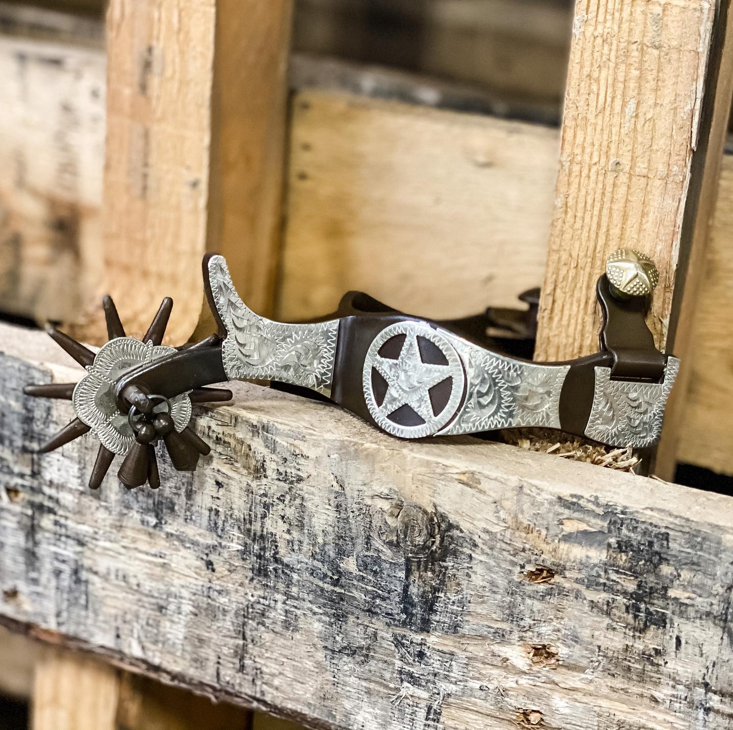 - Antique Brown Finish – Classic western look with a hand-engraved silver star motif overlay.