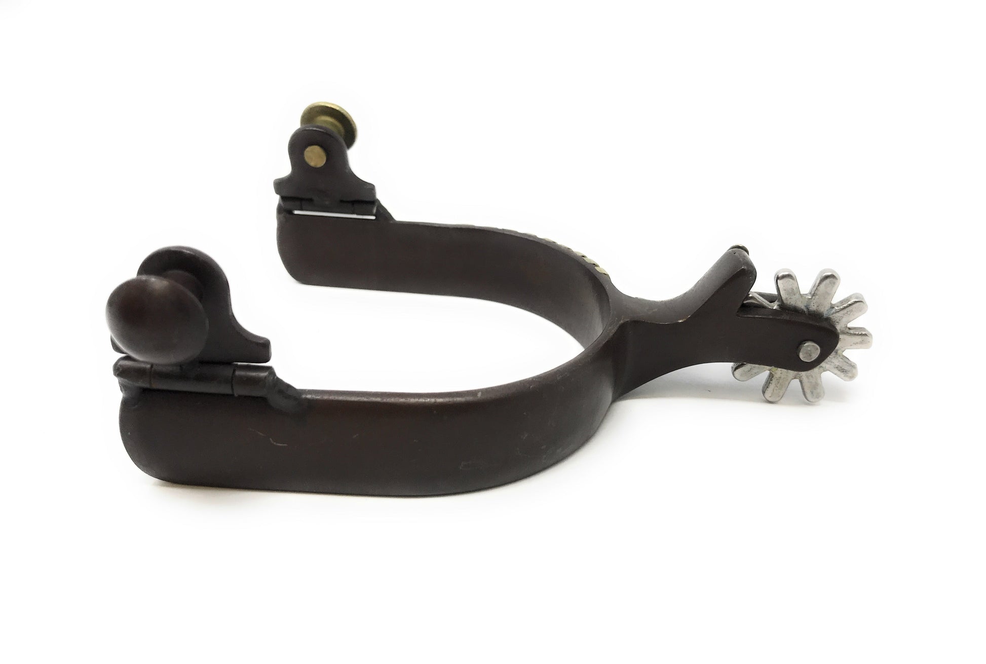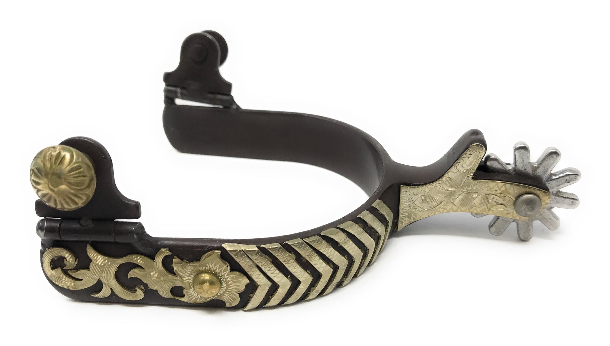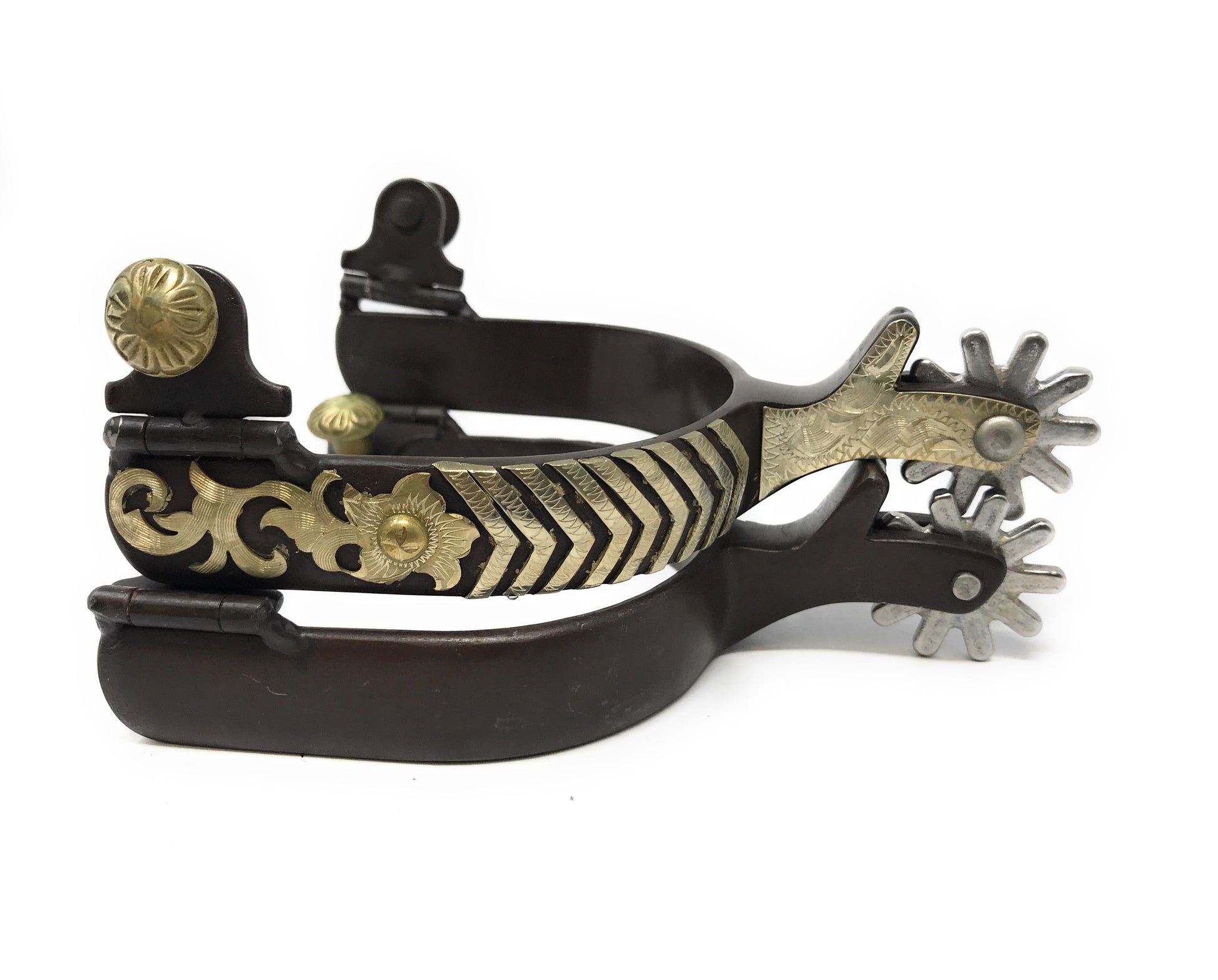 The AJ Tack Men's Silver Floral Bars Spurs are crafted for riders who appreciate fine detailing and durability. These antique brown western show spurs feature a beautifully hand-engraved silver overlay with an intricate floral and silver bars design. The 3⁄4" band provides a secure fit, while the chap guard adds functionality and comfort. Designed for both performance and style, these spurs make a great addition to any rider's gear.