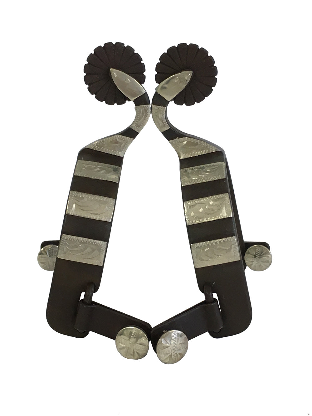 The AJ Tack Men's Swan Shank Antique Brown Spurs are a unique set of western show spurs in antique brown color. Featuring a hand-engraved silver overlay, one side showcases a beautiful swan motif, while the other side highlights a silver bars design. These spurs are crafted for a comfortable fit and are perfect for show or everyday riding.
