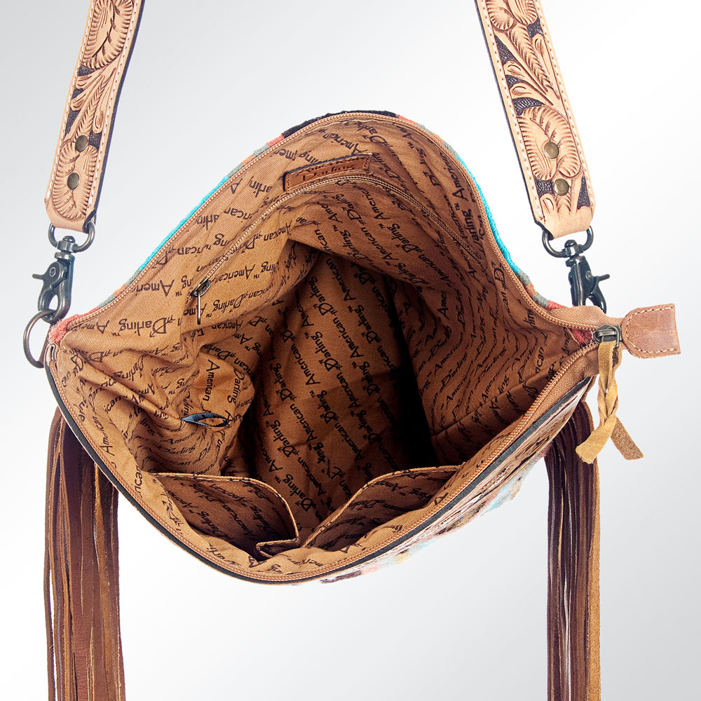 PREMIUM QUALITY MATERIAL: This is a handmade American Darling women's signature crossbody bag made with hand-weaved woolen saddle blanket fabric that gives it a traditional Western yet trendy and elegant look. High-quality soft and supple Eco-friendly vegetable tanned full grain Genuine leather and Hand tooled genuine Leather are also used to make this handbag that ages beautifully as it wears. Available in Size: 15in (H) X 15in (W) X 3in (D)