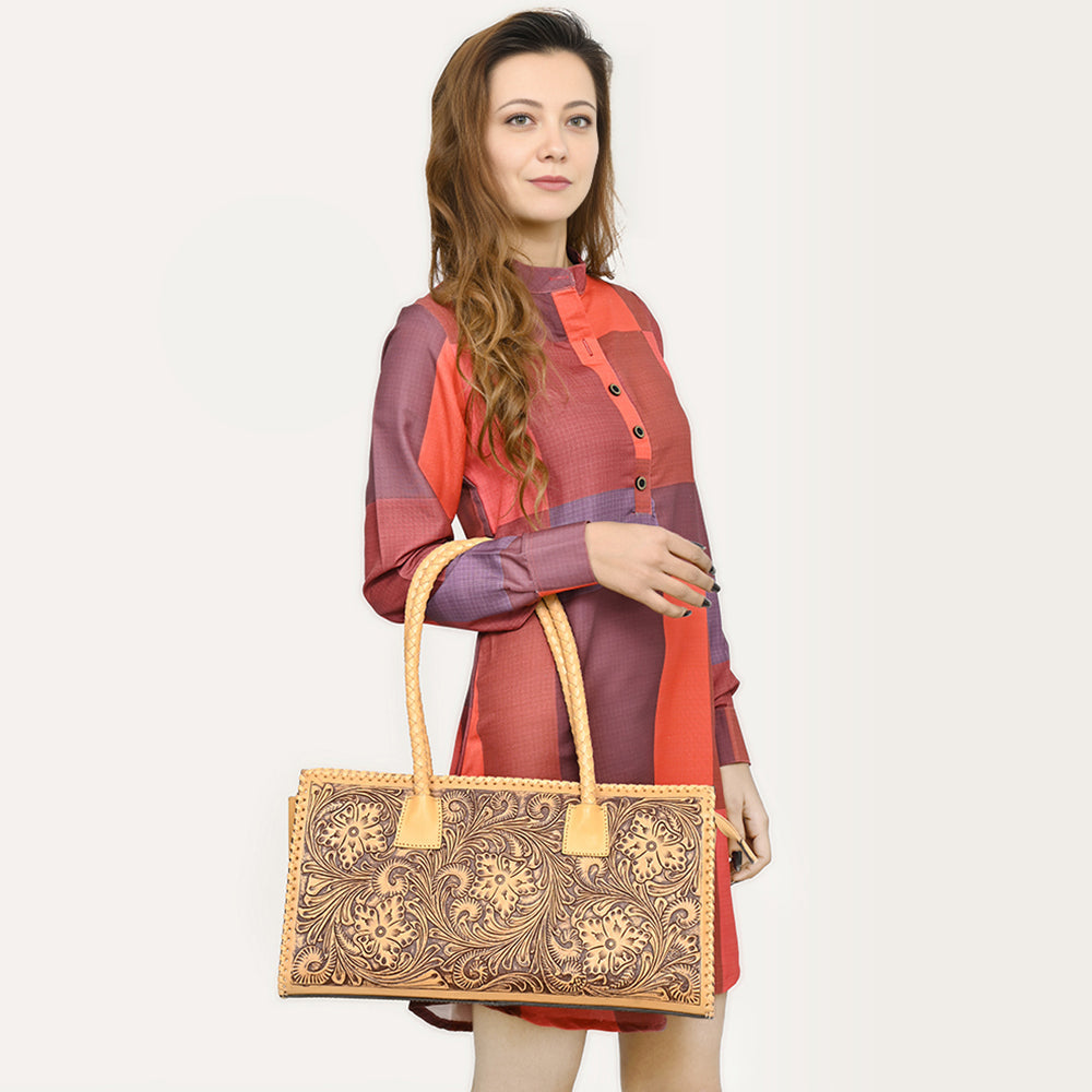 PREMIUM QUALITY MATERIAL: This is a handmade American Darling women's Tote Bag made with soft and supple handpicked Hair on Genuine Cowhide leather. High-quality Soft supple Eco-friendly vegetable tanned full grain and Hand tooled Genuine Cowhide Leather are also used to make this handbag that ages beautifully as it wears. Available in Size: 9in (H) X 16.5in (W) X 5in (D).