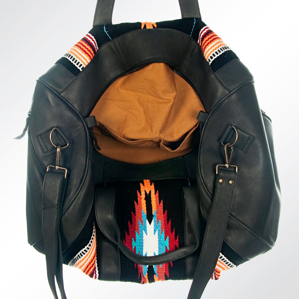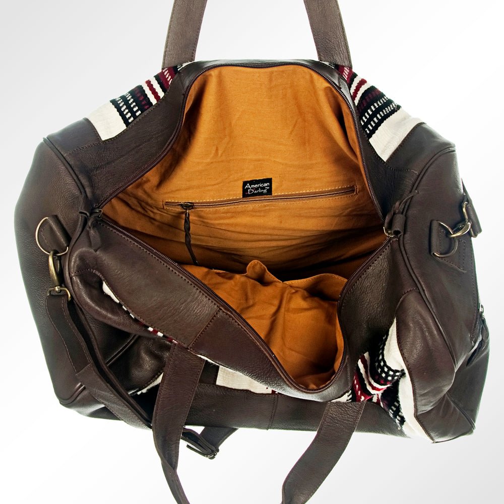 PREMIUM QUALITY MATERIAL: This is a handmade American Darling women's duffle bag made with hand-weaved woolen saddle blanket fabric that gives it a traditional Western yet trendy and elegant look. High Quality Soft and Supple Eco-friendly vegetable tanned full grain Genuine leather is also used to make this handbag that ages beautifully as it wears. Available in size: 12in (H) X 21in (W) X 11.5in (D).