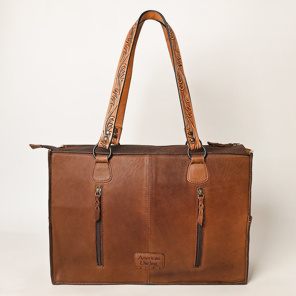 PREMIUM QUALITY MATERIAL: This is a handmade American Darling women's Tote Bag made with soft and supple handpicked Hair on Genuine Cowhide leather. High Quality Soft and supple Eco friendly vegetable-tanned full grain Genuine Cowhide Leather and Hand tooled, carved, and painted Eco friendly vegetable-tanned American Genuine Cowhide Leather are also used to make this handbag that ages beautifully as it wears. Our Tote bags are complemented with a beautiful leather fringe giving them a western look. Size 15in (H) X 17in (W) X 5in (D).