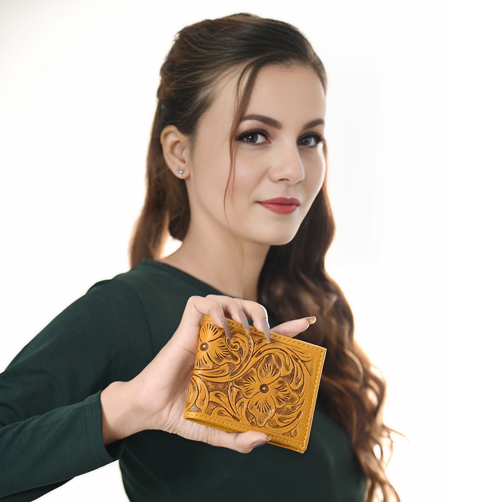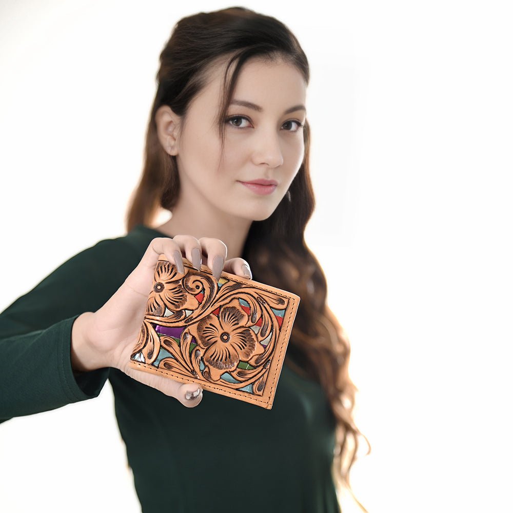 PREMIUM QUALITY MATERIAL: This is a handmade American Darling womens Wallet made with a detailed Western theme Hand tooled, carved, and painted Eco friendly vegetable-tanned American Genuine Cowhide Leather. It is exquisitely done by the finest craftsmen in the country. High Quality Soft and supple Eco friendly vegetable-tanned full grain Genuine leather is also used to make this handbag that ages beautifully as it wears. Available in Size: 3.5in (H) X 4.5in (W)