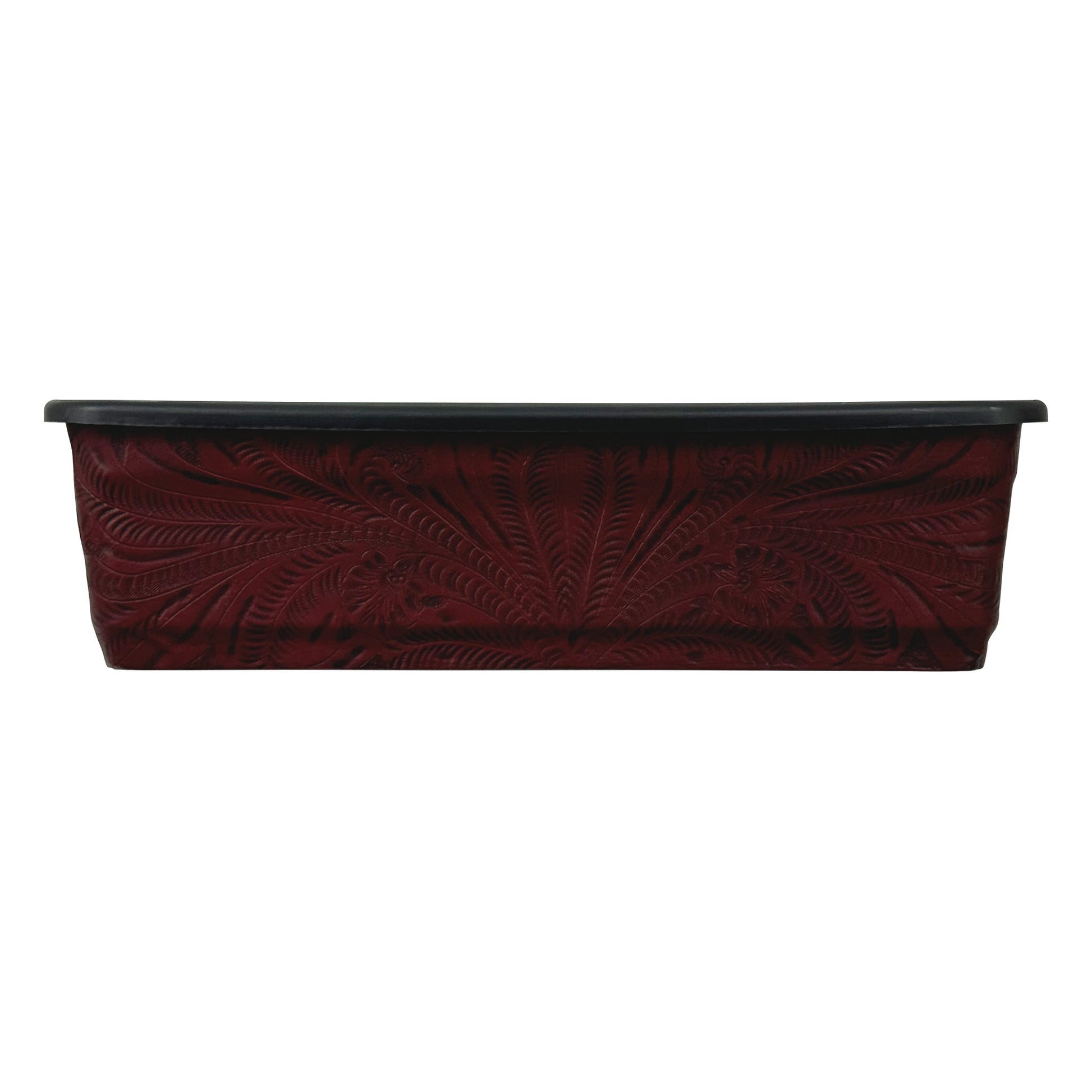 The American West at Home 18" Rectangle Planter features a spacious design perfect for showcasing your favorite plants. Crafted with rich, tooled leather accents, this large planter combines durability with sophisticated Western artistry. Its sturdy construction ensures reliability indoors or on the patio, making it an elegant and practical addition to any décor.