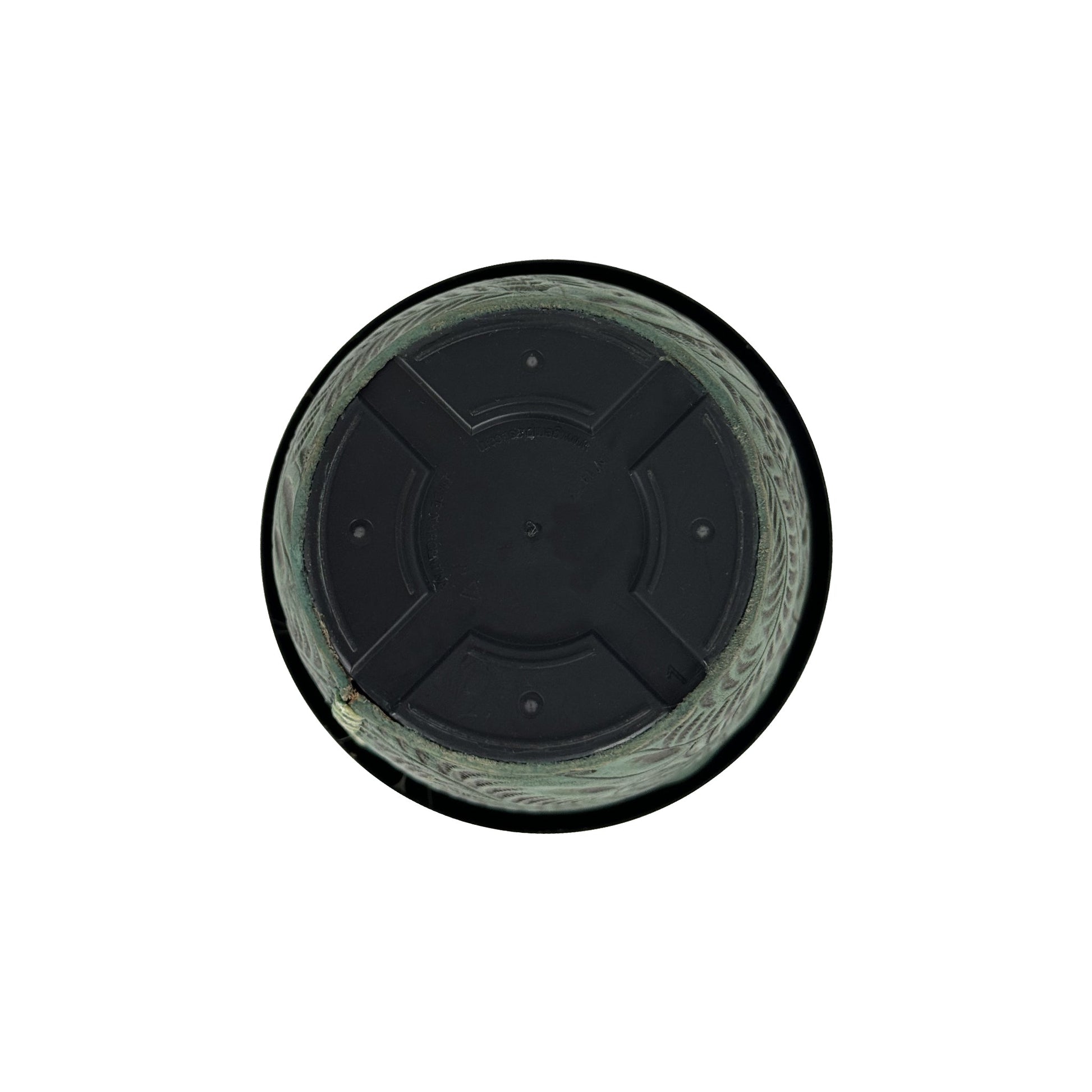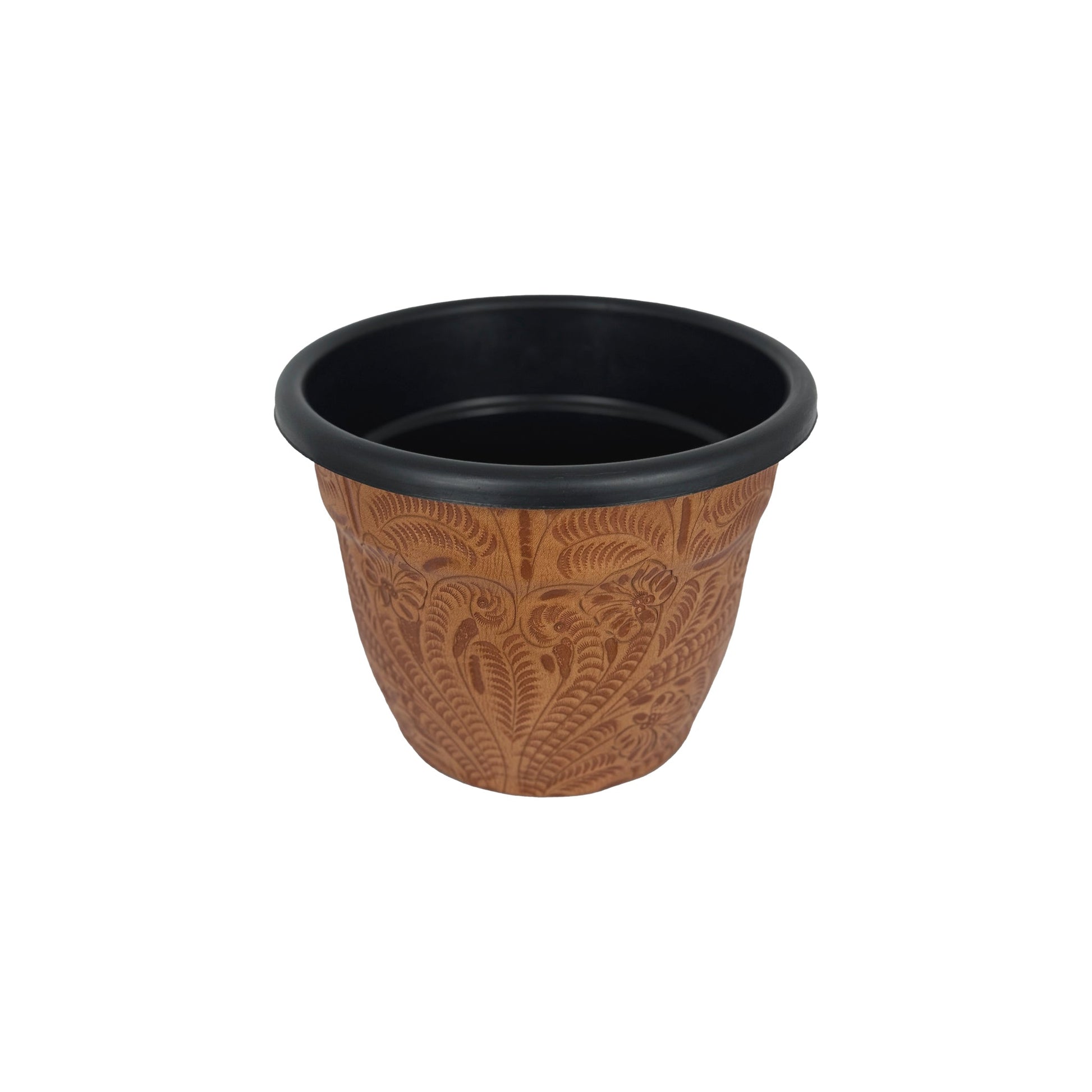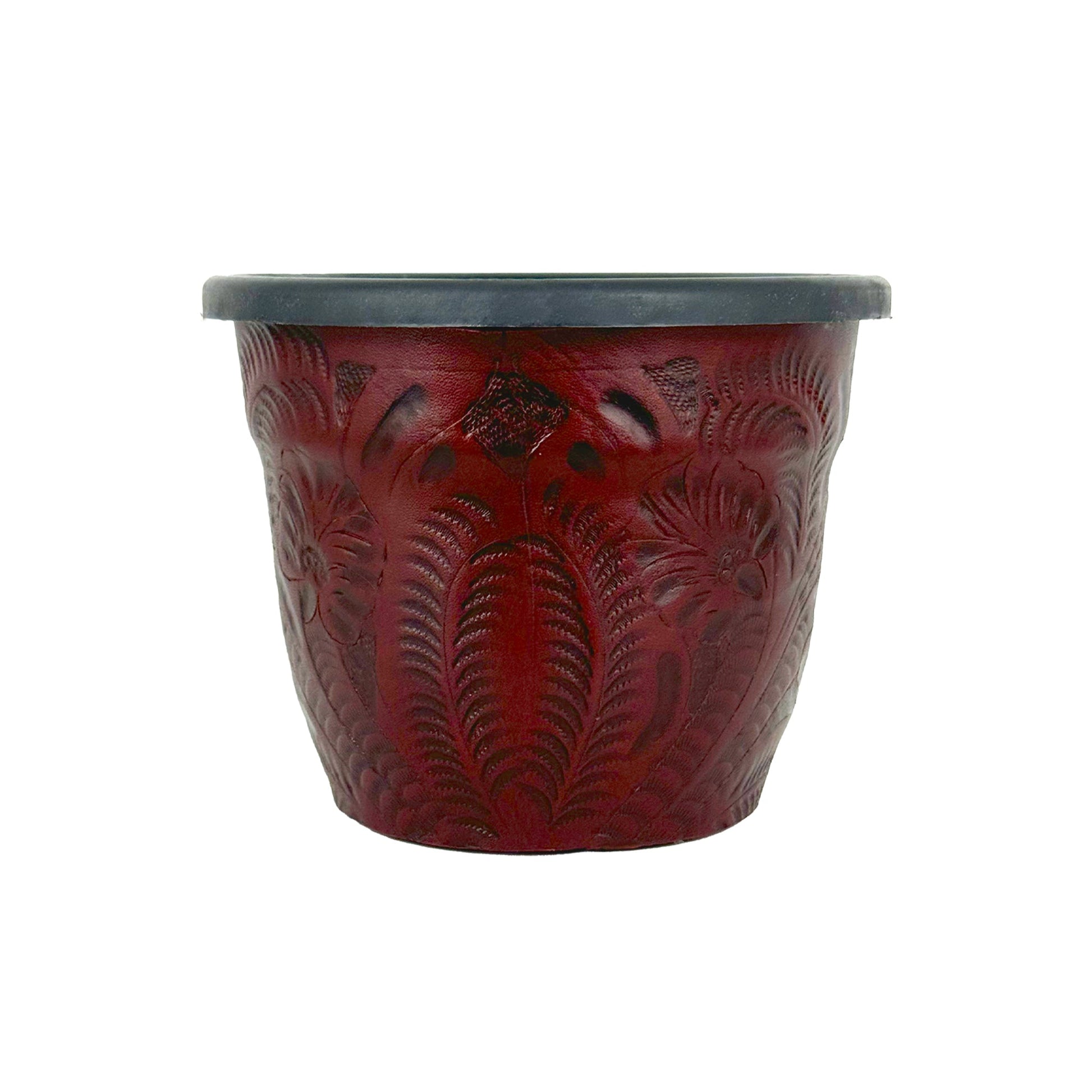 Small round planter. Plastic insert accented with 100% hand-stained and hand-tooled genuine leather. Can easily pop out holes for draining.