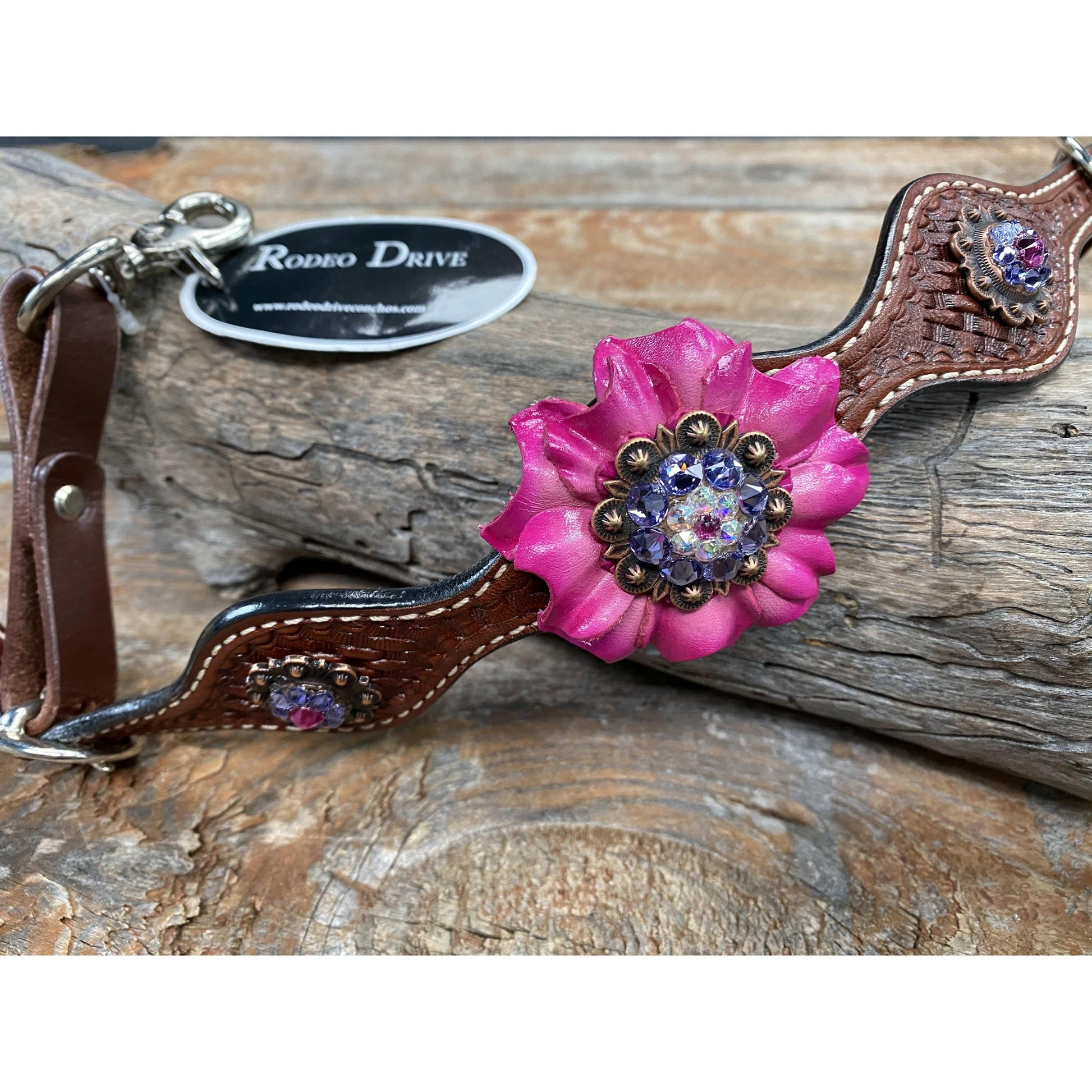 Decorated with copper Fuchsia/AB/Lilac crystal conchos and a pink carnation.