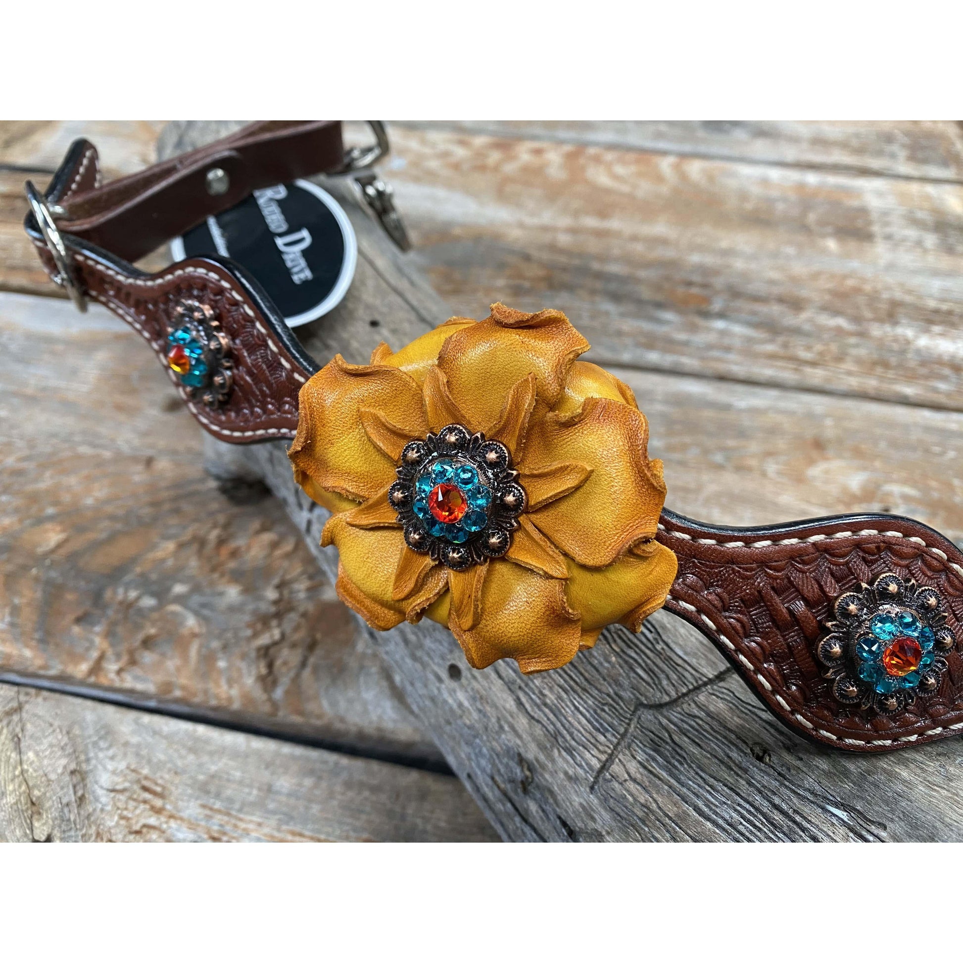 Decorated with copper Fire Opal/Teal crystal conchos and yellow gardenia.