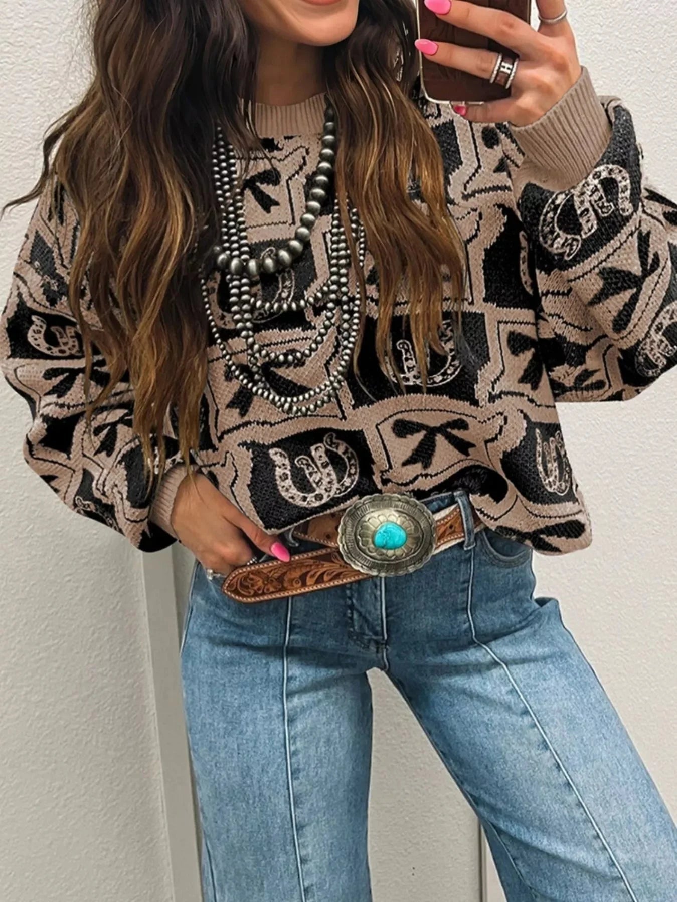 The Bows & Horseshoes Pattern Sweater combines comfort and style with its slightly stretchy fabric blend of 52% viscose, 26% polyester, and 22% polyamide, offering a flexible fit that moves with you. Designed with practical pockets, it adds convenience without compromising on aesthetic appeal. This versatile sweater is crafted for easy care—simply machine wash cold and tumble dry low to maintain its quality and shape. Ideal for layering or wearing alone, it delivers reliable comfort and a unique patterned look suitable for various occasions.