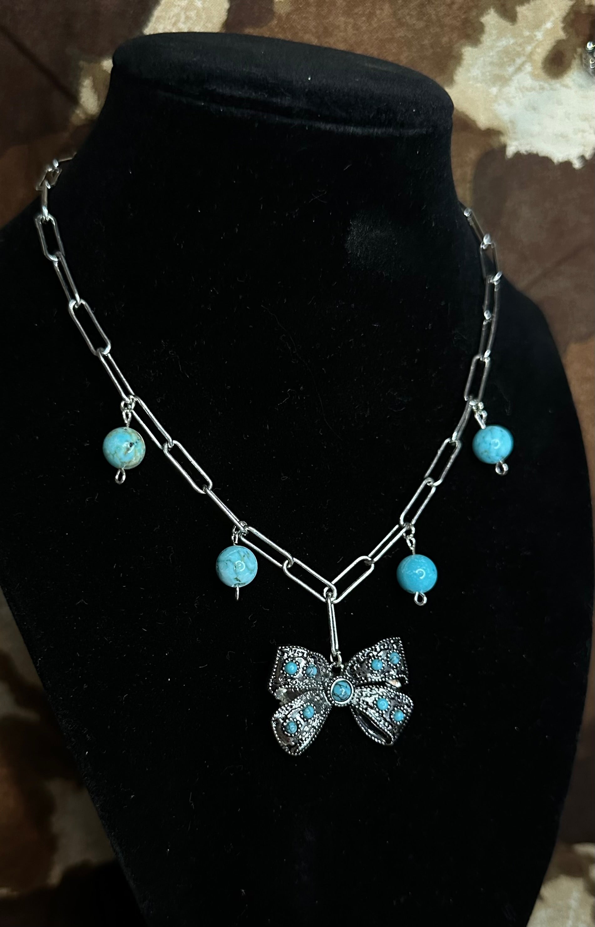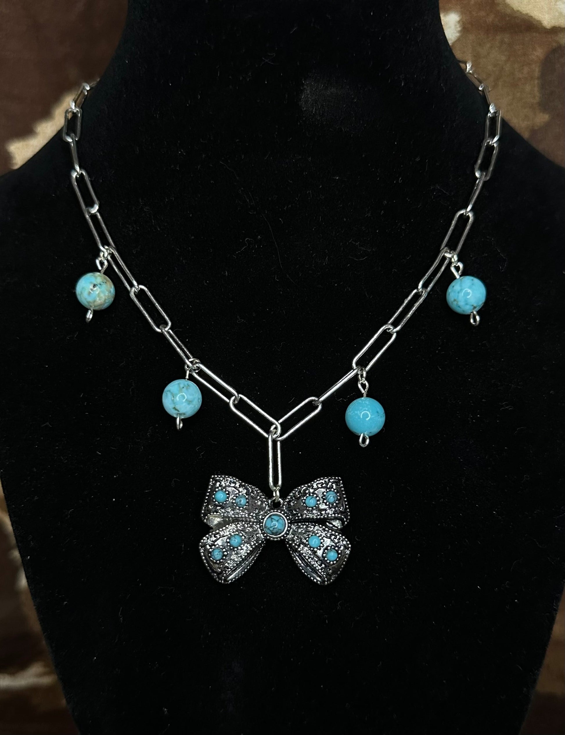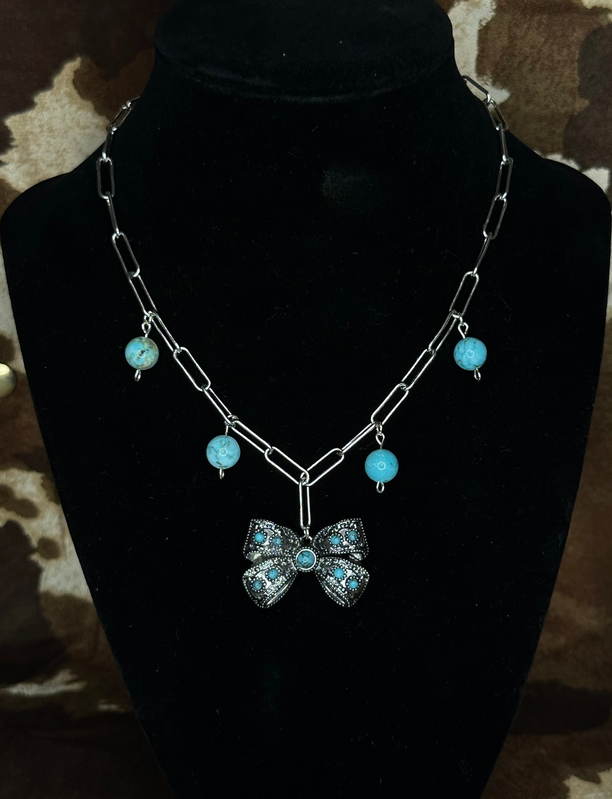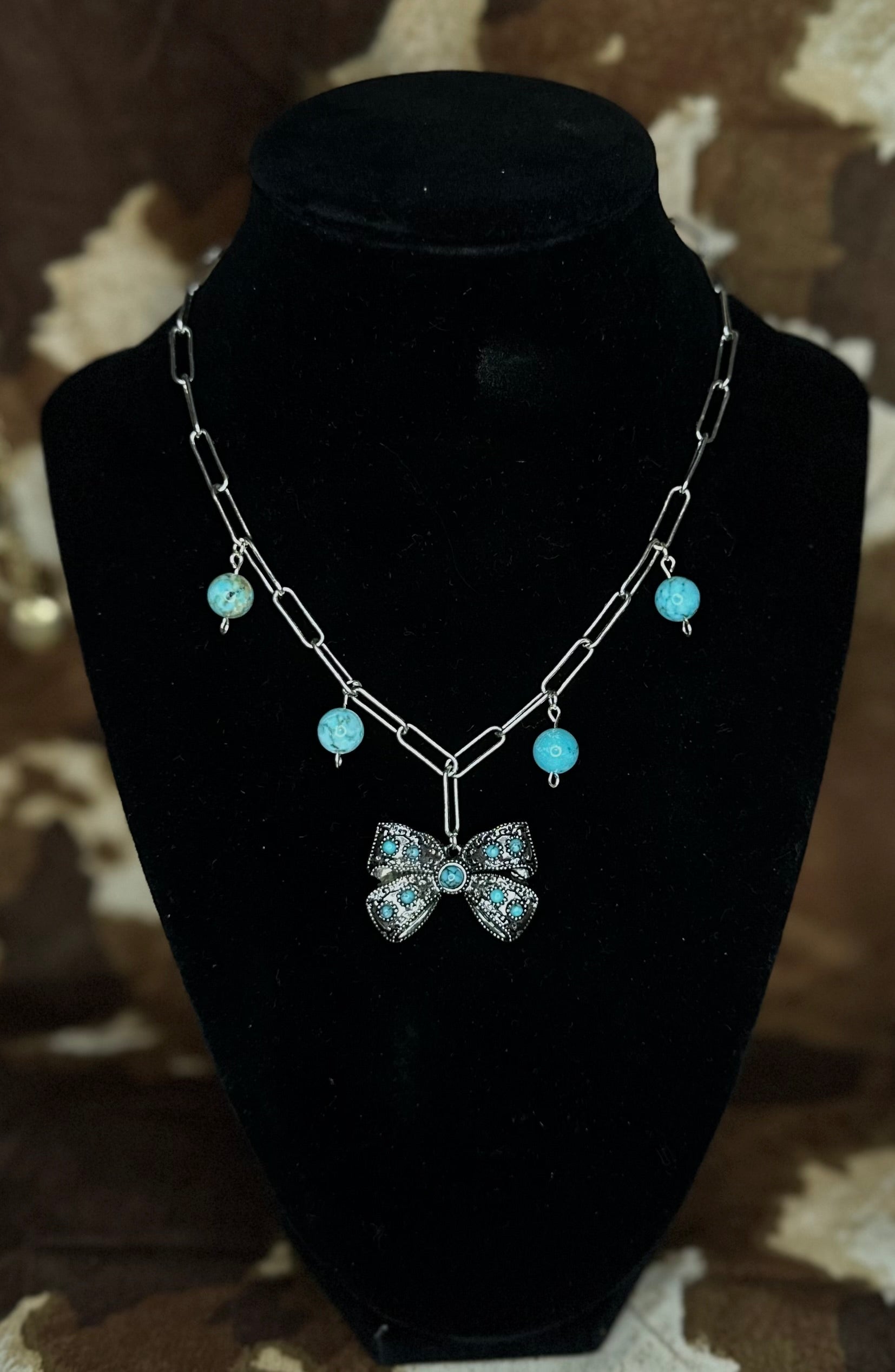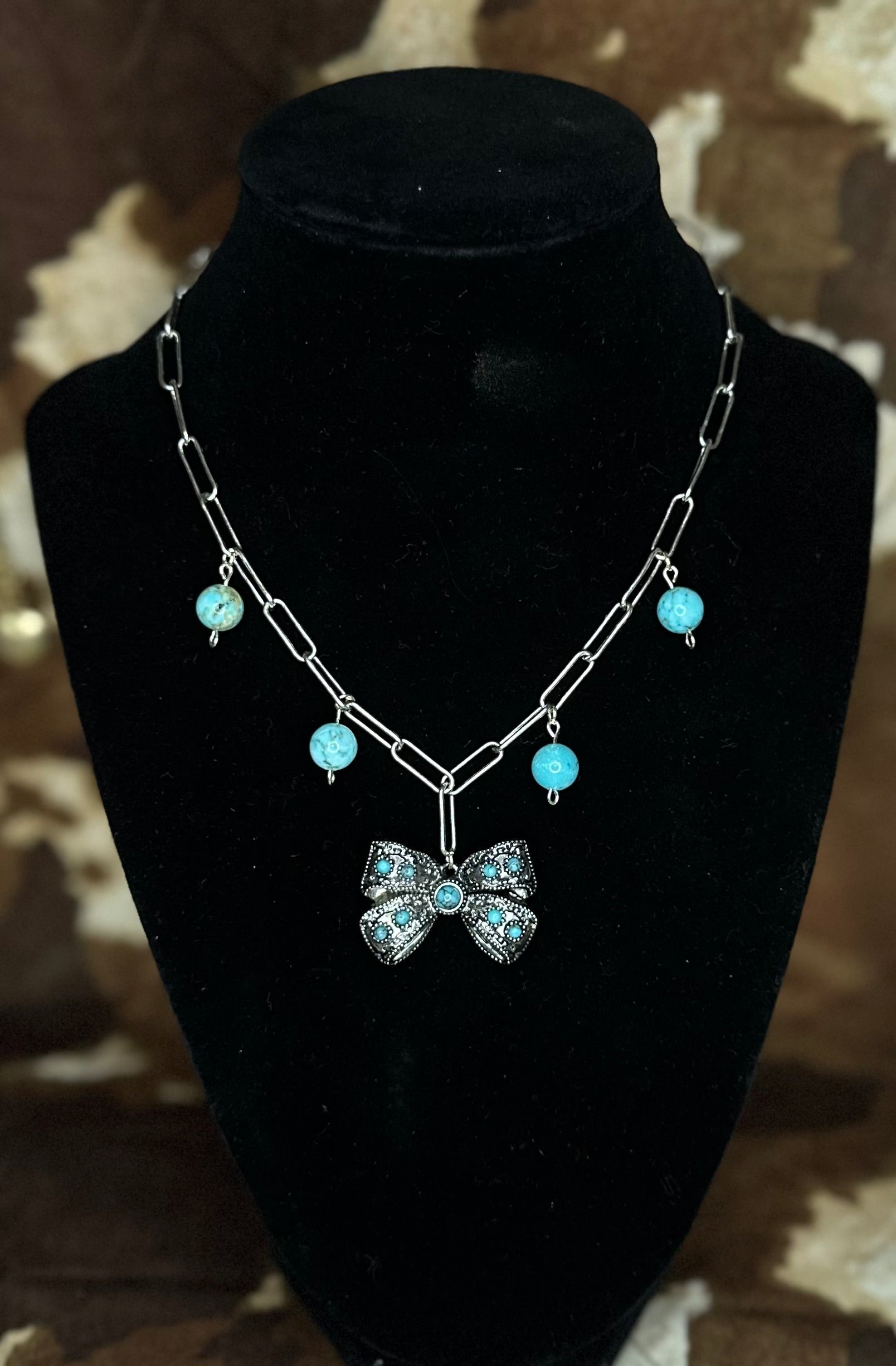 Rugged meets darling in the Bronc & Bow necklace. This handcrafted piece pairs a bold silver chain with swinging turquoise bead charms and a detailed antique-style bow pendant studded with turquoise stones. It’s playful, powerful, and full of western heart — just like the girl who wears it.