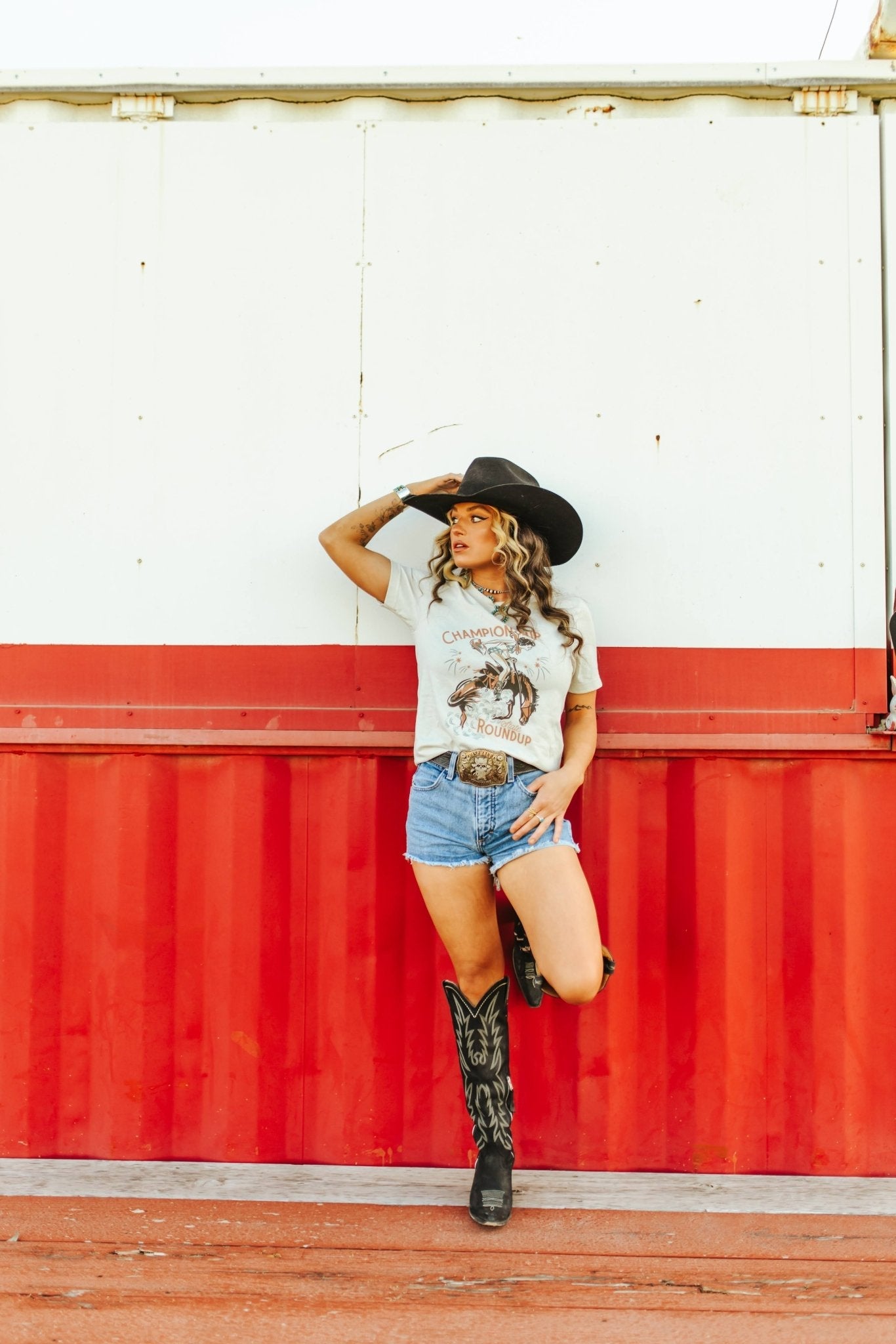Showcase your state pride with our Championship State Roundup Graphic Tee! This tee features a cowgirl on horseback graphics. Whether you're a rodeo enthusiast or simply love the Western aesthetic, the Championship State Roundup Graphic Tee is sure to keep the eyes on you.