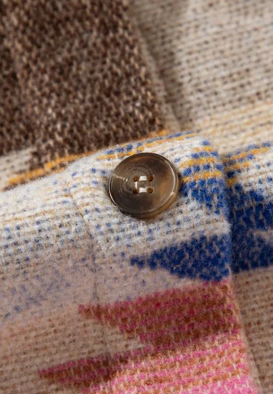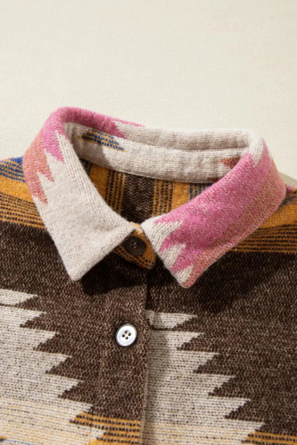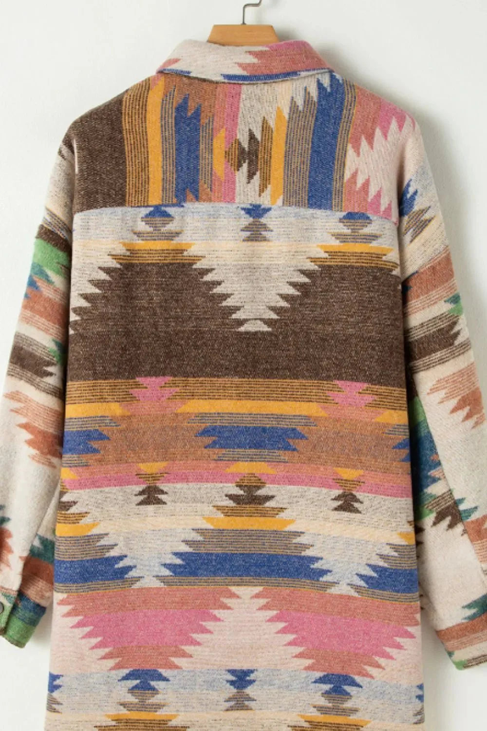 The Cheri Geometric Button Up Long Sleeve Jacket offers a distinctive geometric pattern crafted entirely from 100% polyester, delivering both style and durability. Designed with a regular thickness suitable for layering, this jacket features a classic button-up front for adjustable comfort and ease of wear. Its unlined body ensures a lightweight feel without sacrificing structure, making it ideal for transitional weather. Easy to maintain, the jacket is machine washable in cold water and can be tumble dried on low, ensuring it retains its shape and vibrant pattern over time. A refined choice for those seeking both function and modern design in their outerwear.