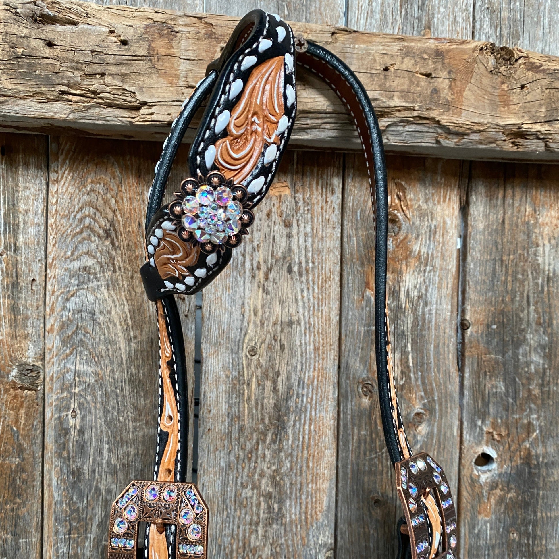 Browband, one ear, wither strap and breastcollar is floral tooled buckstitch style. They are decorated with copper AB crystal conchos and buckles.