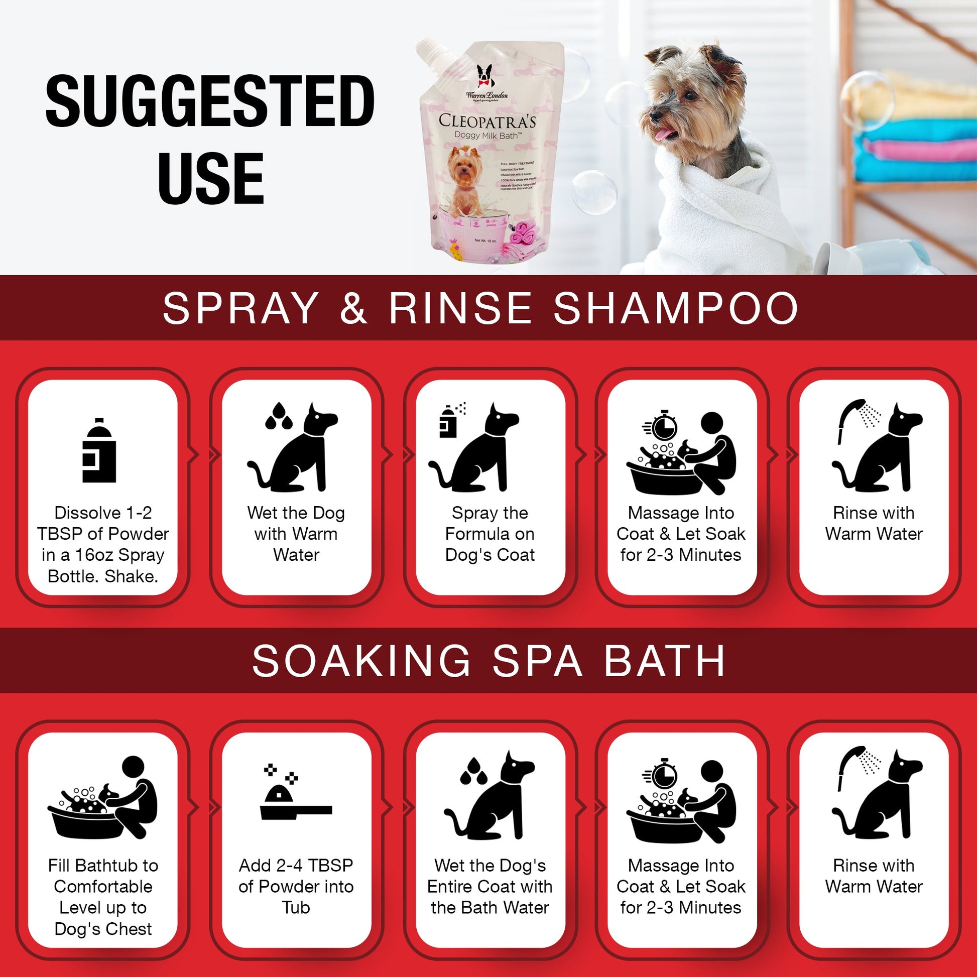 - Two Unique Applications - Either Soak or Spray-On - Dissolve the Powdered Milk Bath in a bath tub to soak and apply like a traditional Dog Shampoo - Or Dissolve the Powder in a Spray Bottle to Spray-On, Brush-Through, and Rinse-Out.