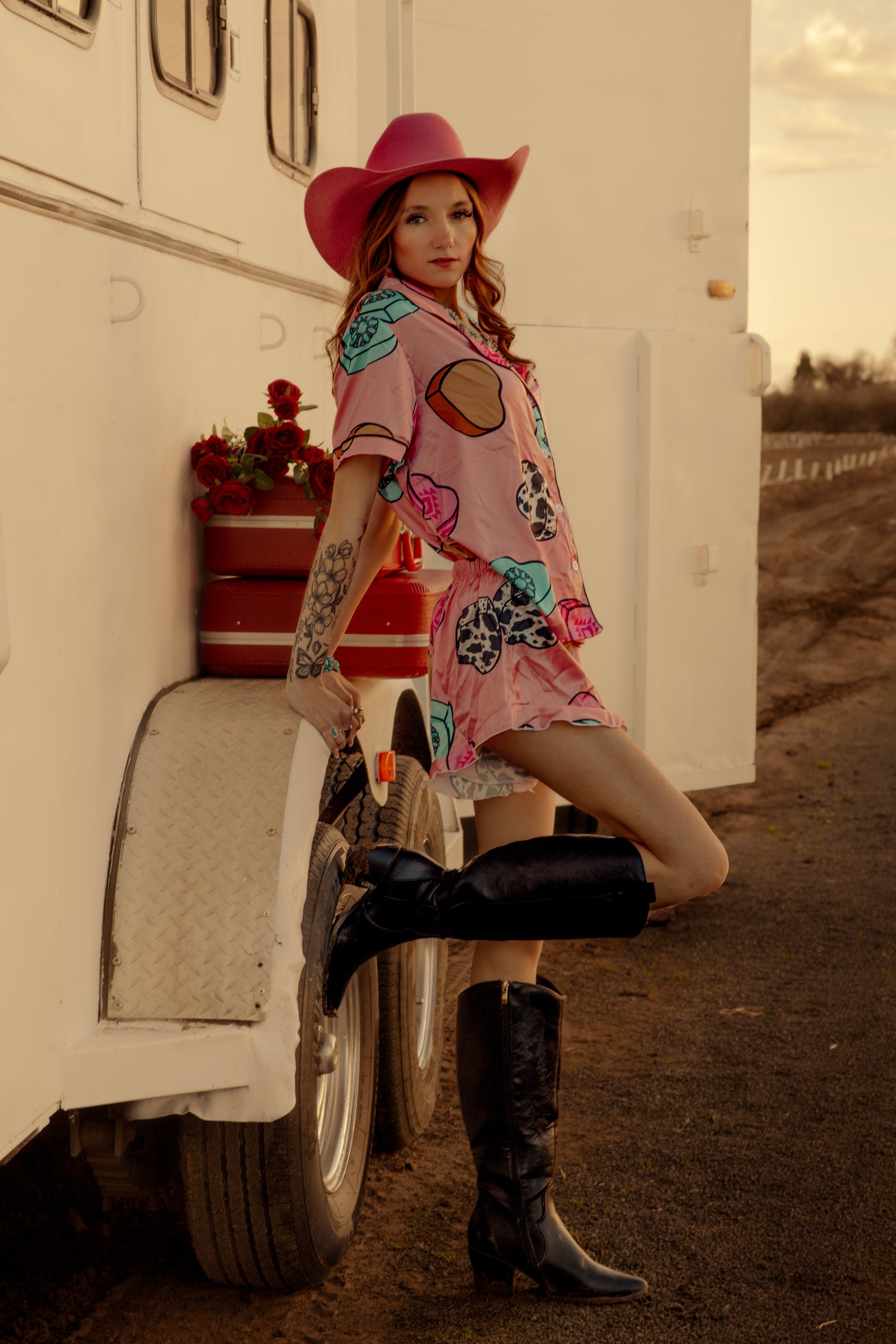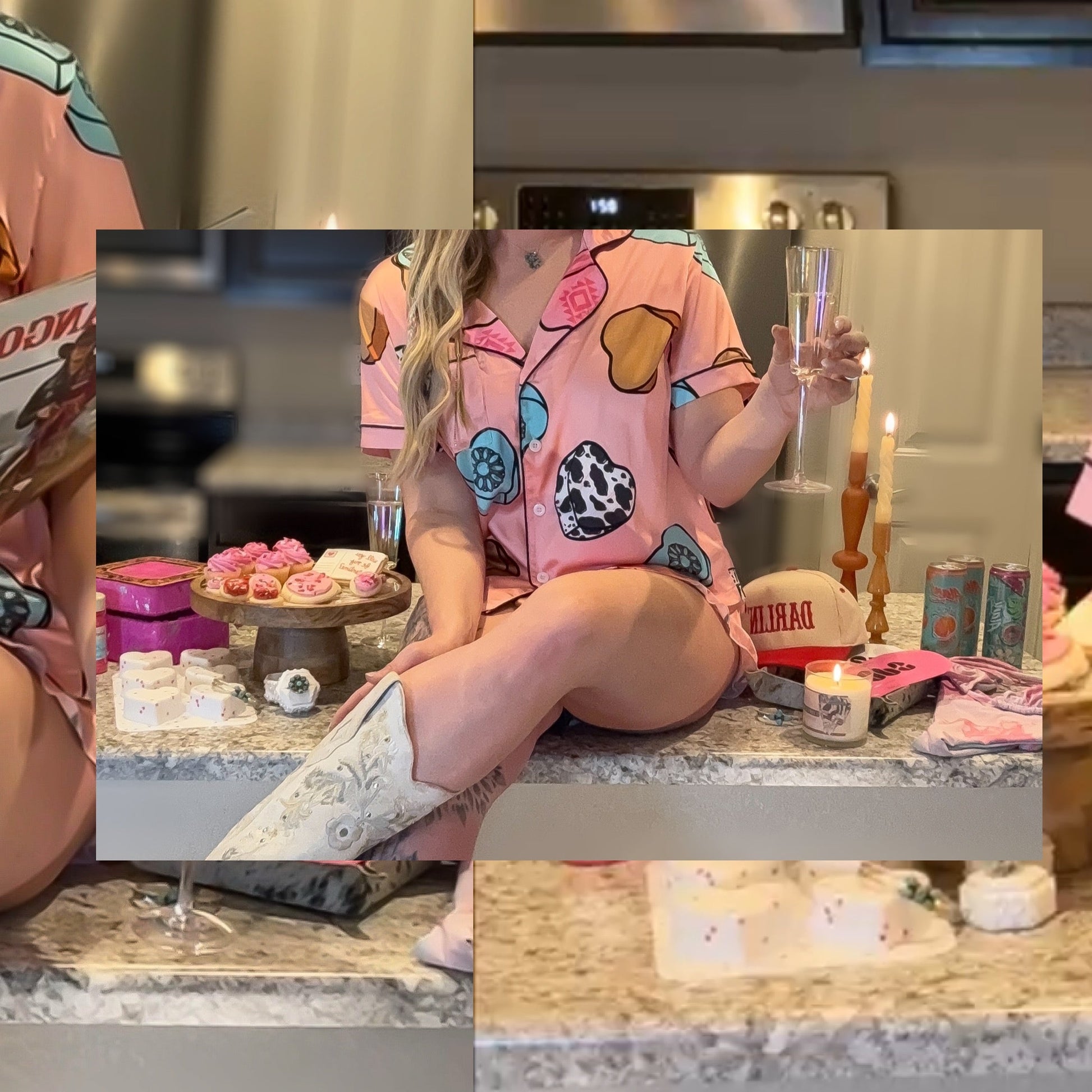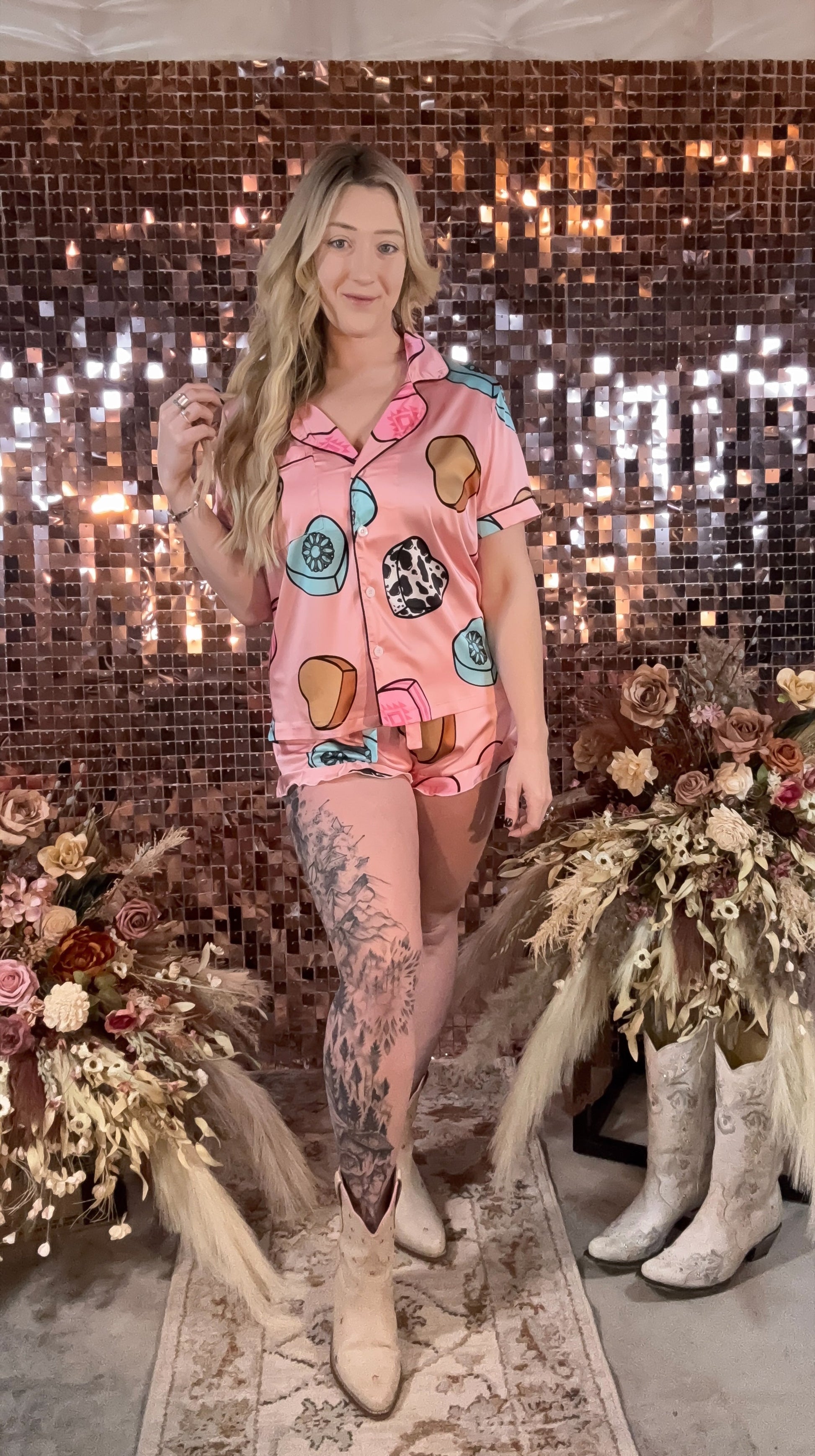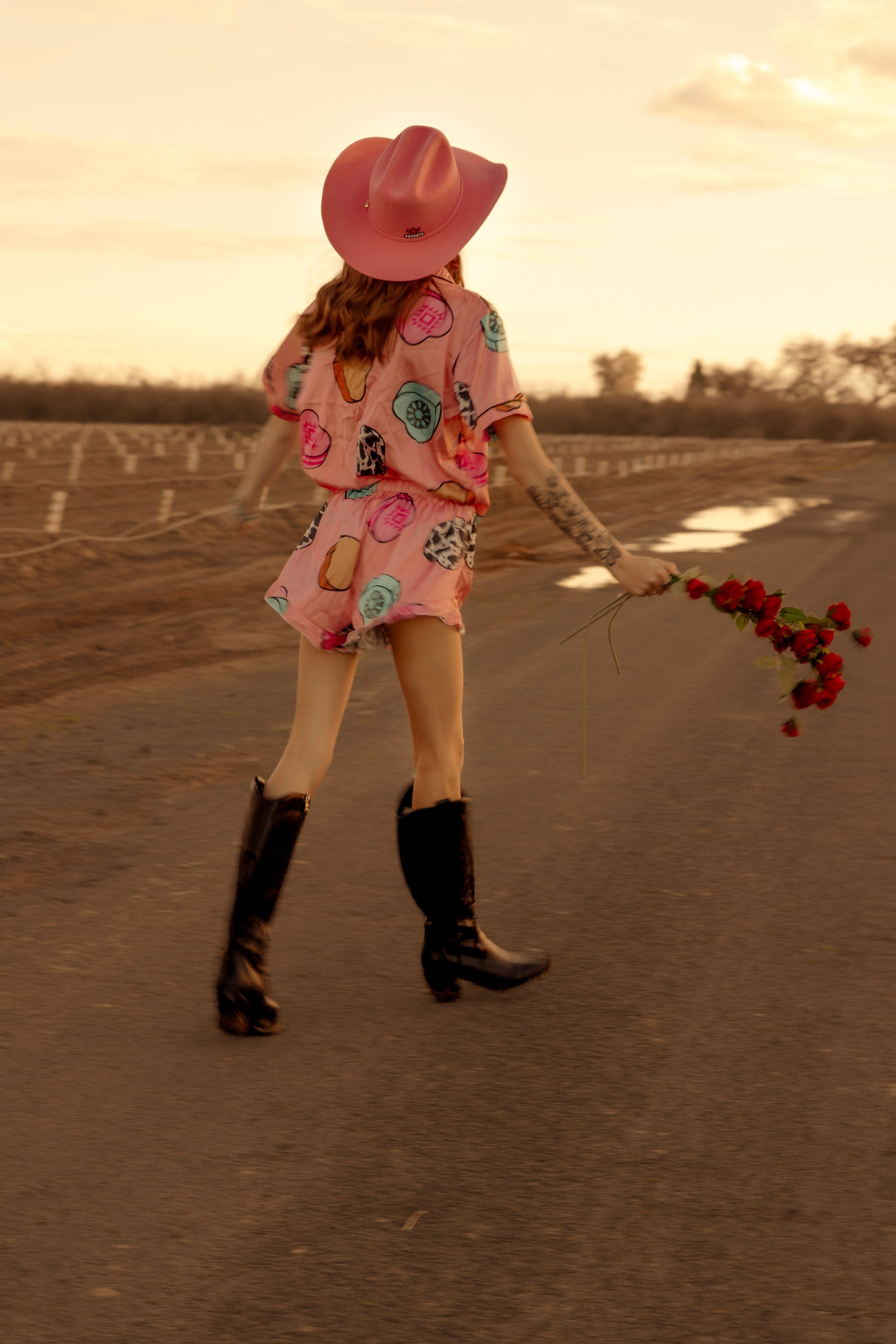Indulge in whimsical slumber with the Cowboy Candy Heart Silky Pajama Sets. Made of smooth, luxurious fabric, these pajamas feature a playful cowboy candy heart design. Perfect for a cozy night in or a fun sleepover with friends. Yeehaw!