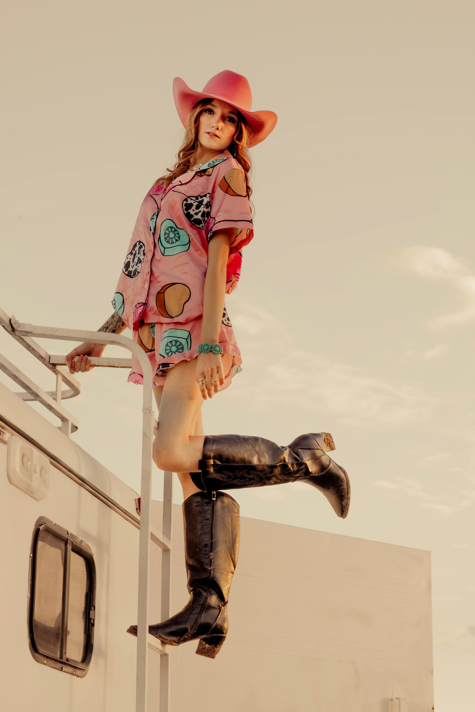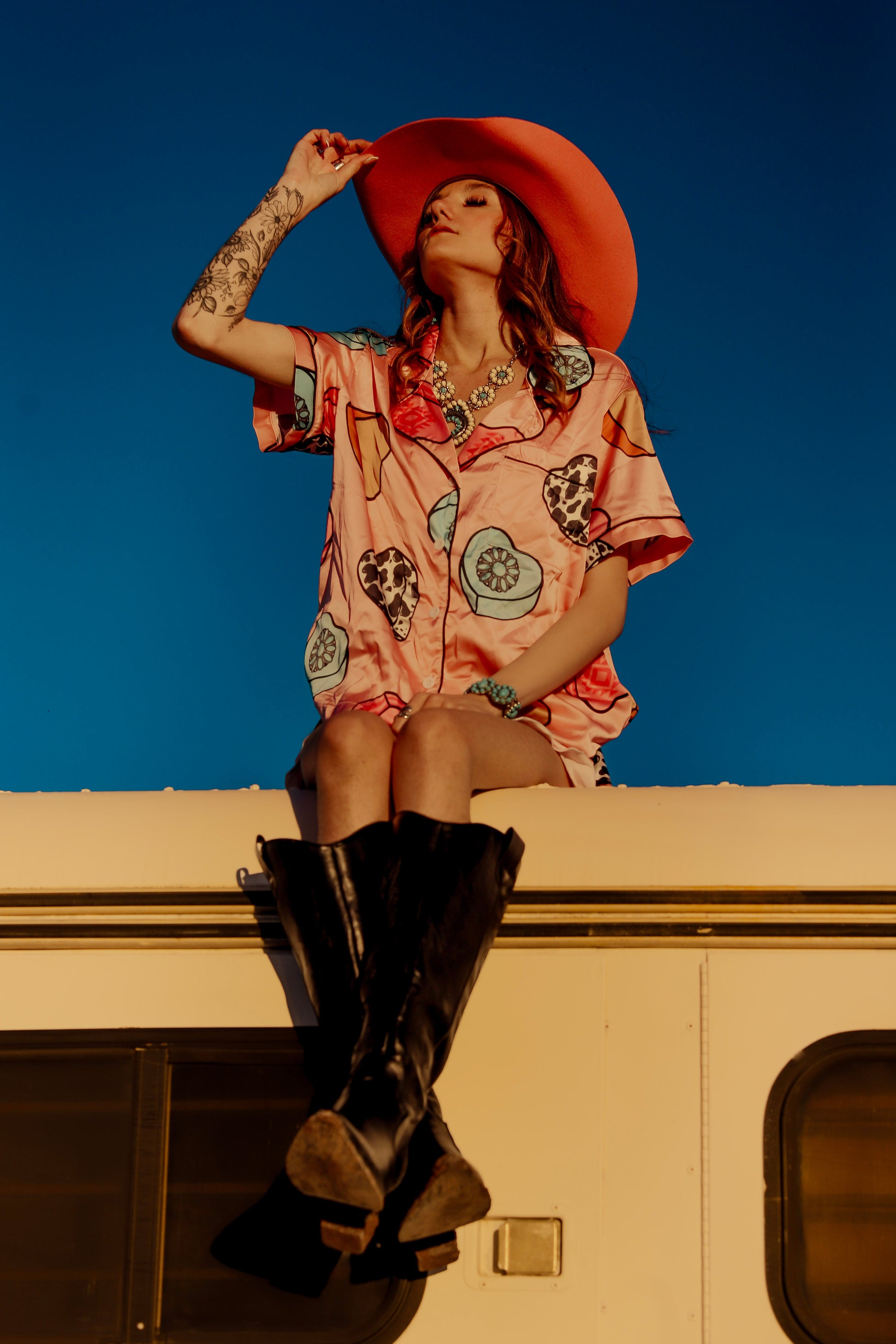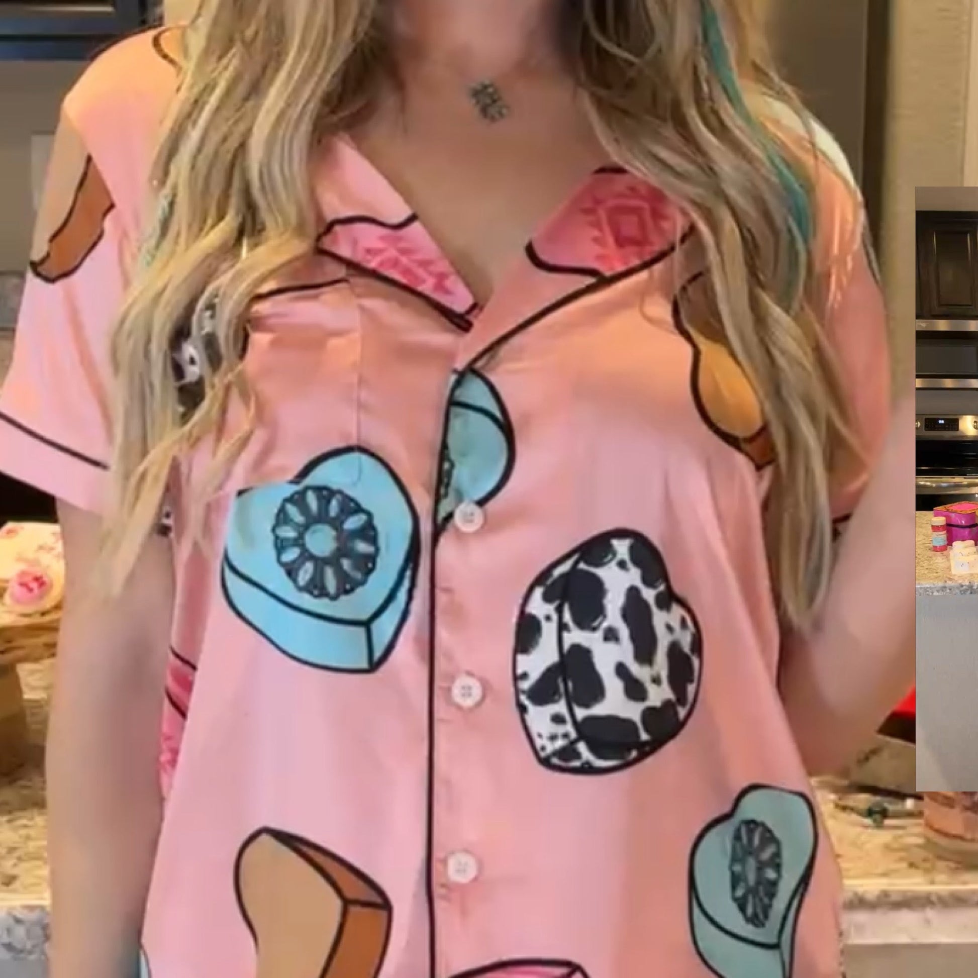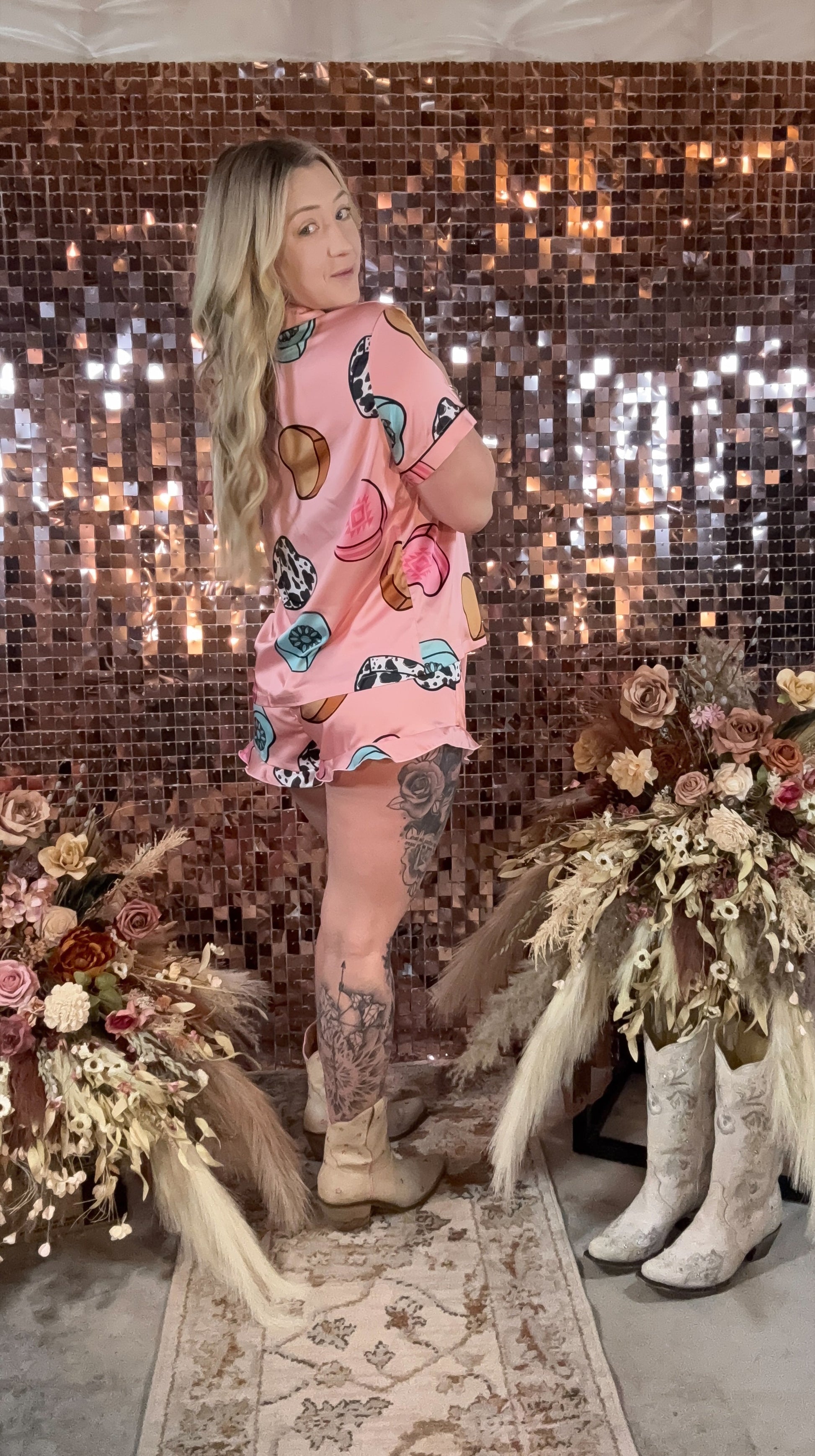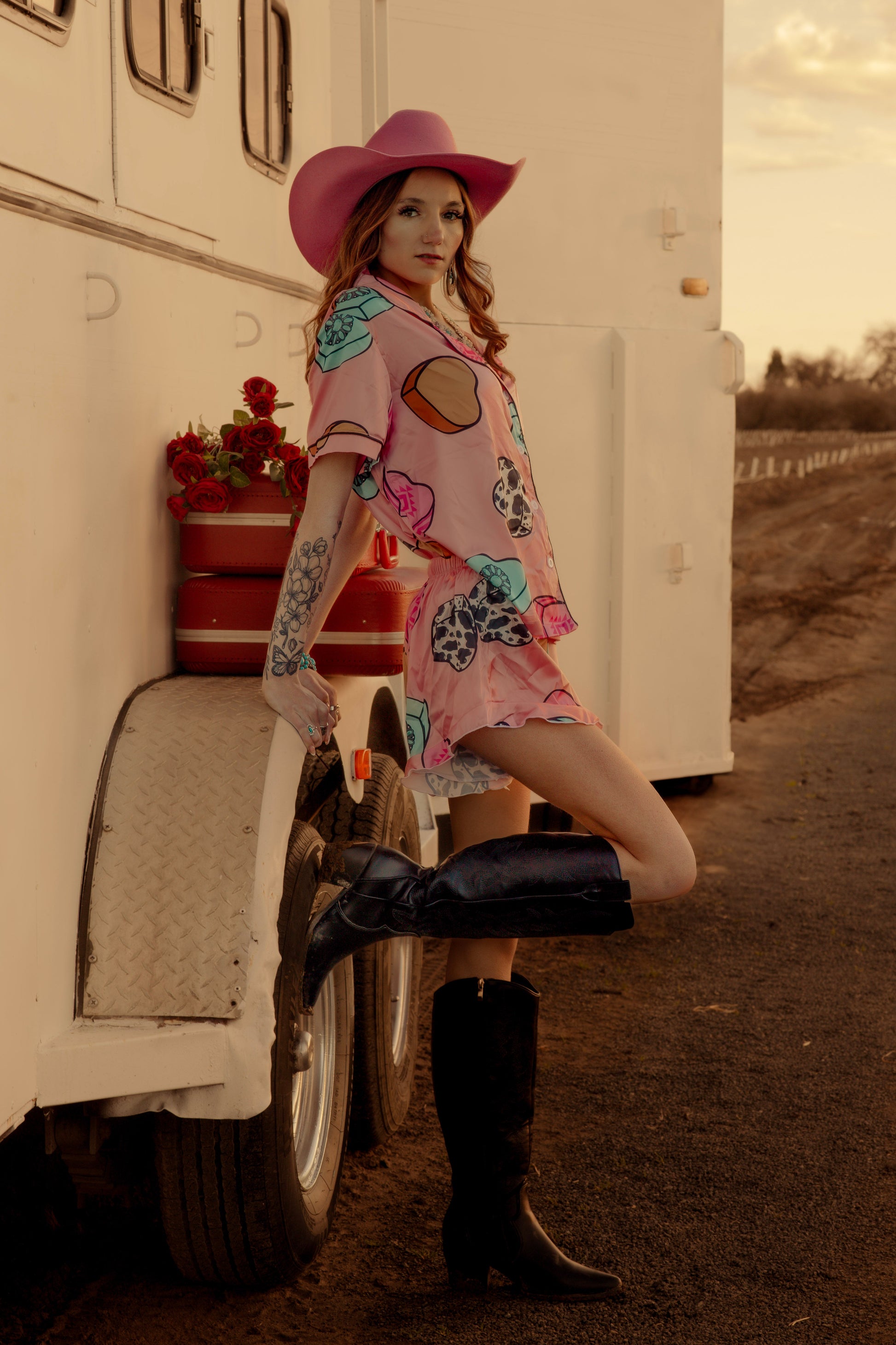 Indulge in whimsical slumber with the Cowboy Candy Heart Silky Pajama Sets. Made of smooth, luxurious fabric, these pajamas feature a playful cowboy candy heart design. Perfect for a cozy night in or a fun sleepover with friends. Yeehaw!