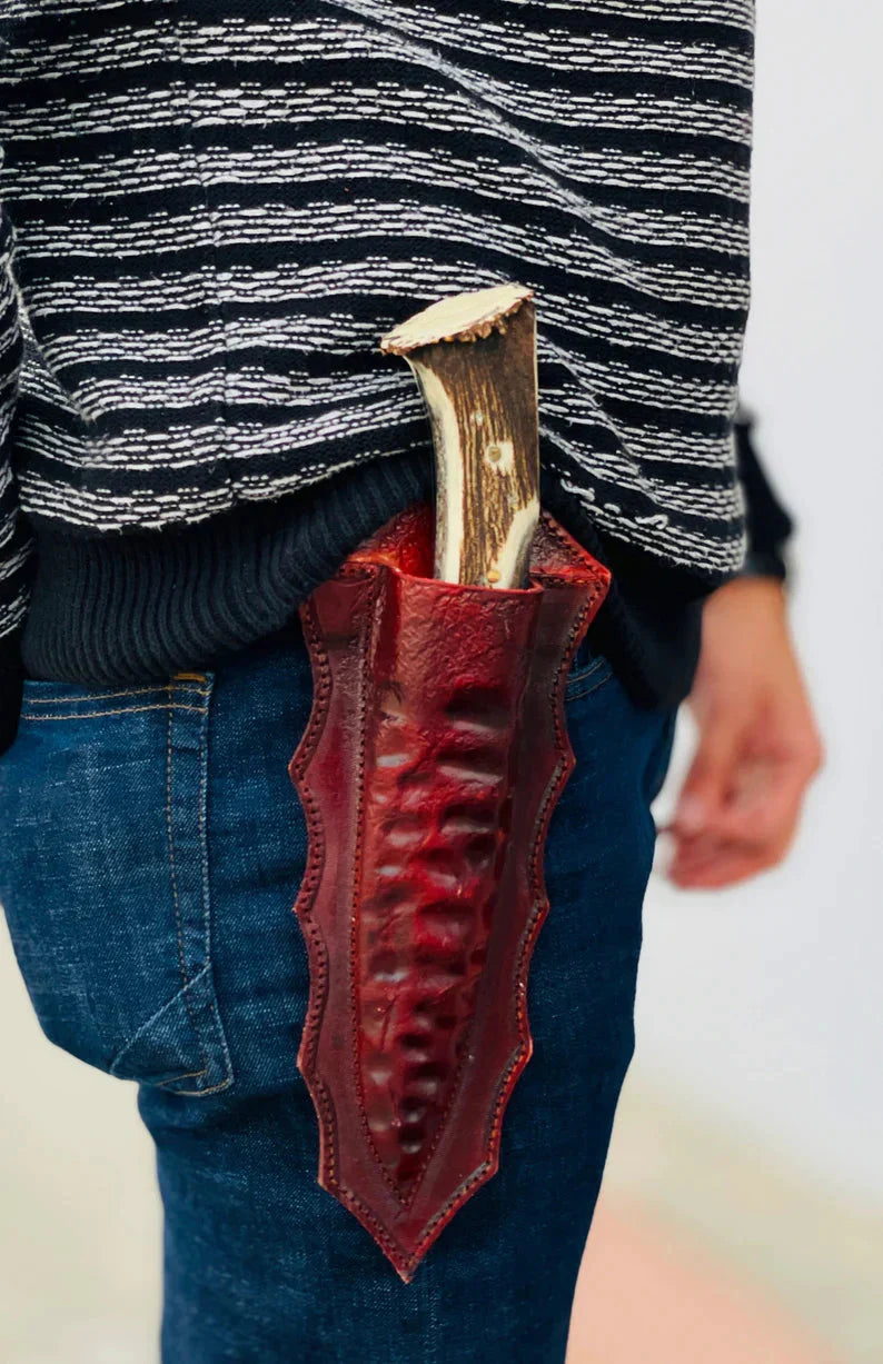 The antler horn handle delivers a secure, natural grip that feels at home in the wild, while adding a rustic, collectible charm. Paired with a premium handmade leather sheath, this knife is perfect for safe carry on hunting trips, camping expeditions, or seasonal outdoor adventures.