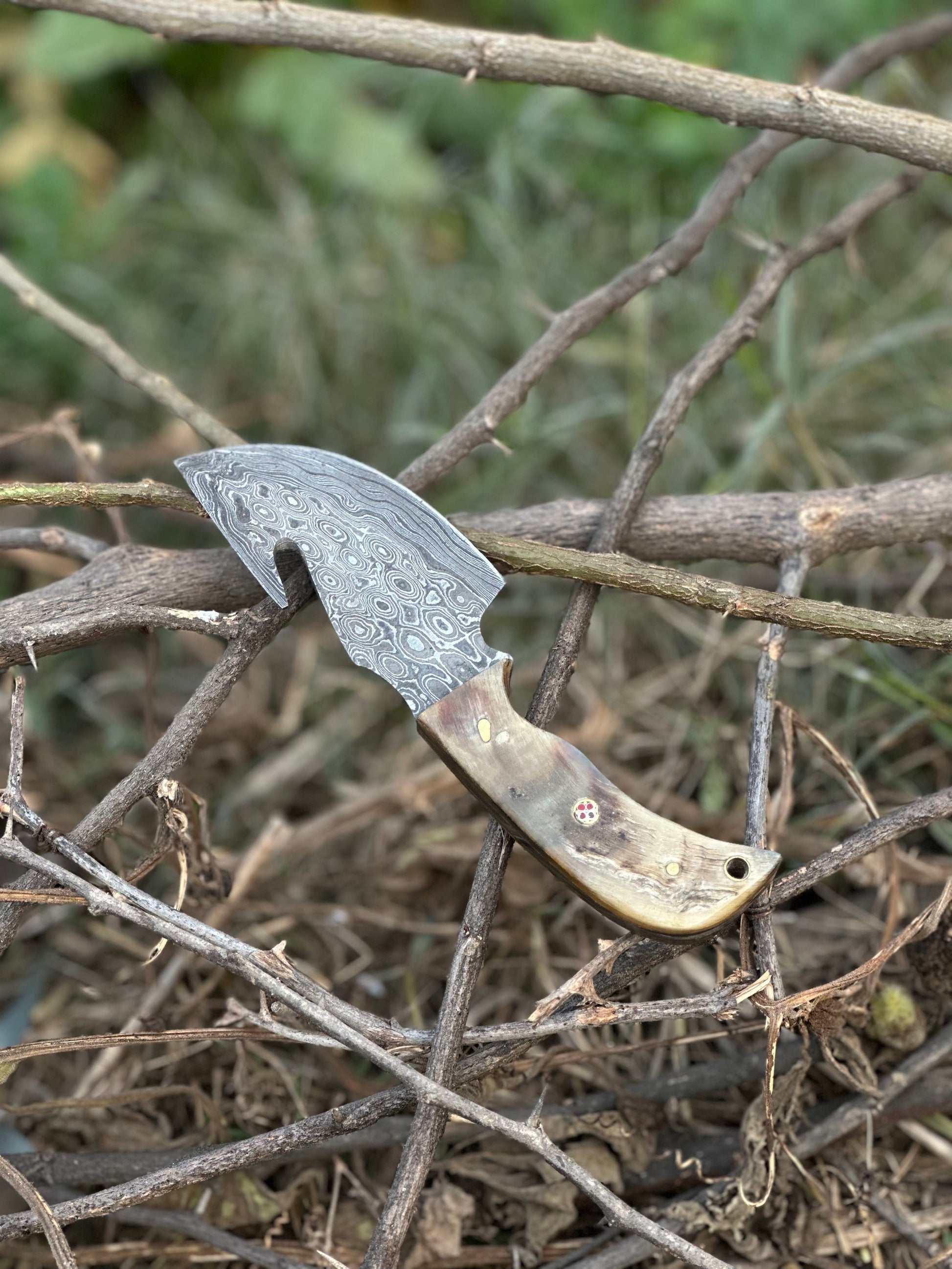 Custom Handmade Damascus Steel Guthook Skinning Knife with Sheep Horn Handle - 7.5” with Leather Sheath
