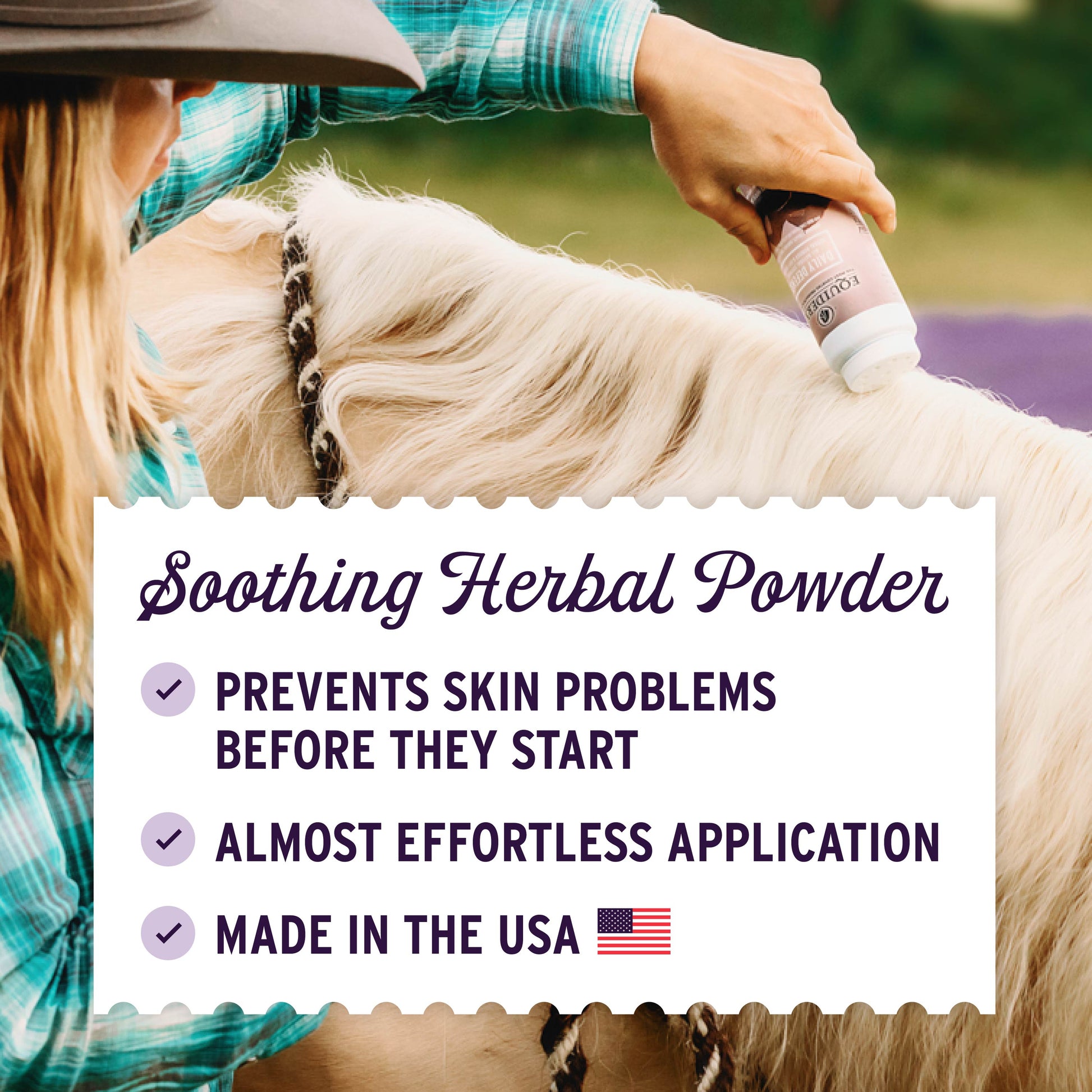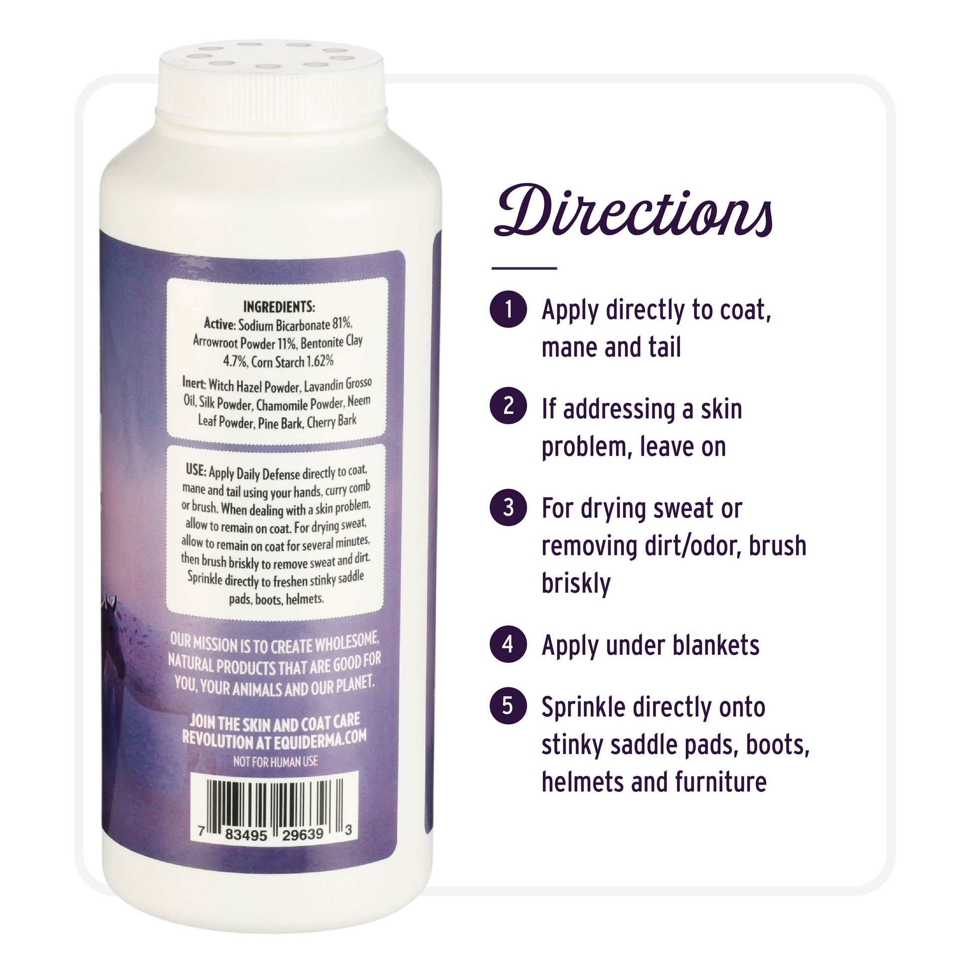 Is the weather too cold for a bath? Out on the trail with a dirty, sweaty horse and no access to water? No time to groom? Need a boost for your own hair, body, helmets or boots? Equiderma's got this! Our 100% active ingredient herbal formula is far more than your typical dry shampoo, you won't find any obnoxious perfumes here. Daily Defense calms hives, soothes sweet itch and insect bite hypersensitivity, and inhibits the growth of invasive environmental stressors. Dry up unwanted moisture that can lead to trouble, sprinkle under blankets and tack (and furniture, shoes, pet beds, you get it). Designed to improve the condition of the skin, for a shiny, glossy, healthy coat. Check out the ingredient list, you'll be hooked!