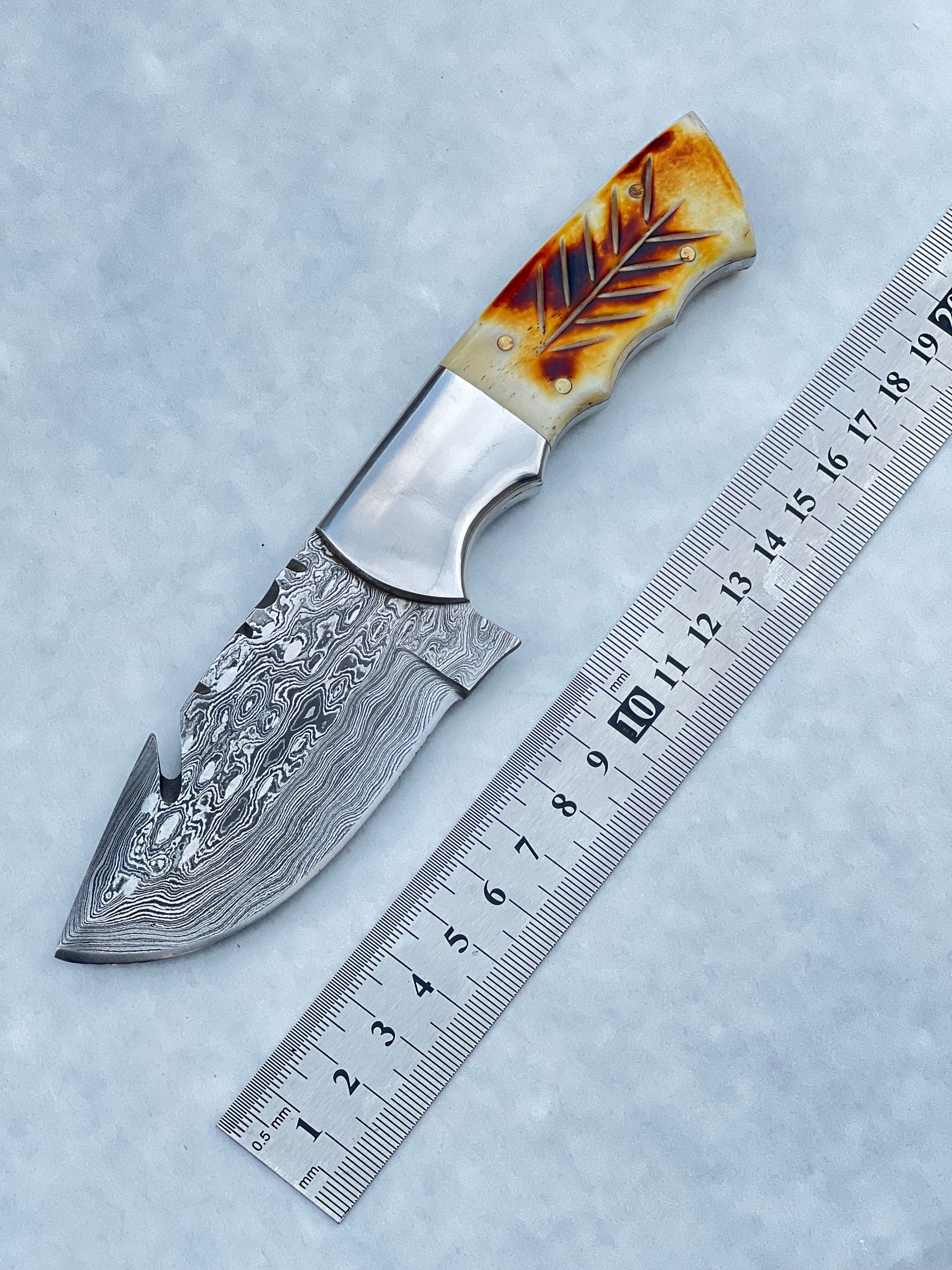 Damascus Steel Fixed Blade Knife with Camel Bone & Rosewood Handle - 7.5" Custom Pocket Knife with Leather Sheath